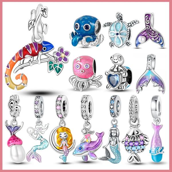 オーシャンマーメイドテールタートルビーズチャームレディース用、925スターリングシルバー、DIYブレスレット、高級ジュエリー作りギフト、オリジナル