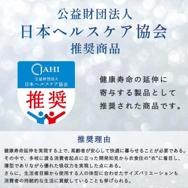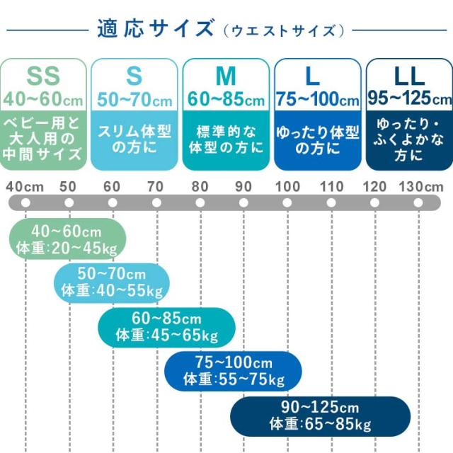 | ・適用ウエスト又はヒップサイズ SSサイズ:40〜60cm(20〜45kg) ・吸収量の目安 600ml(1回の排尿量150mlとして、排尿4回分) ・素材 表面材:ポリオレフィン・コットン不織布 吸水材:ポリオレフィン系不織布、綿状パルプ、高分子吸水材、吸収紙 防水材:ポリオレフィン系フィルム 伸縮材:ポリウレタン 結合材:スチレン系エラストマー合成樹脂 |