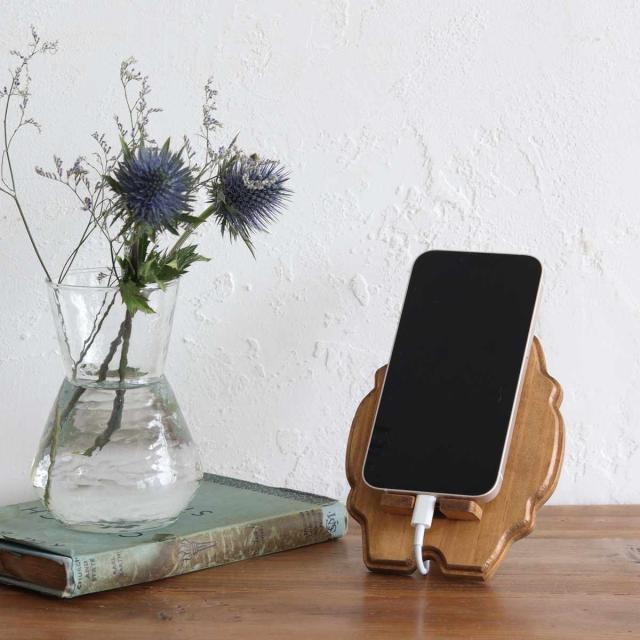温かみのあるアンティークな木製スマホスタンドです。実用的でありながら、インテリアに馴染むお洒落な佇まいが魅力です。