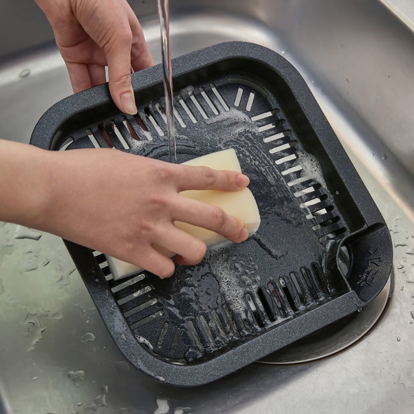 受け皿に水を入れることで油をキャッチし、煙が出ない構造に。