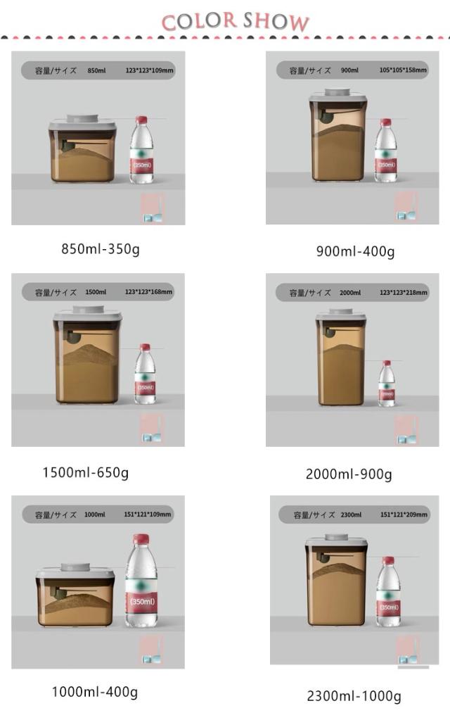 | サイズについての説明 | 容量:850ml-350g 900ml-400g 1500ml-650g 2000ml-900g 1000ml-400g 2300ml-1000g |