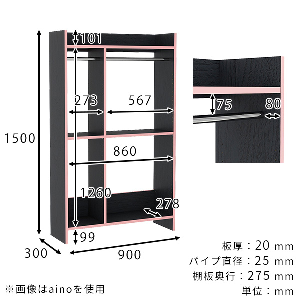 サイズ:約幅900 奥行300 高さ1500 mm(内脚の高さ:99 mm)