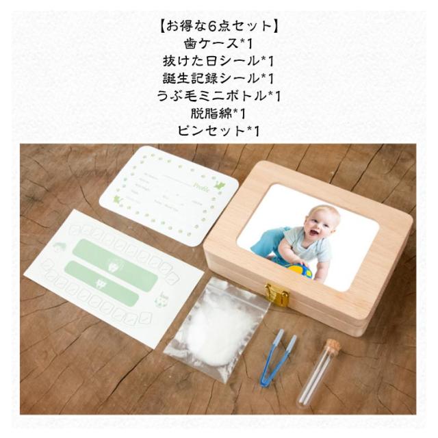 | 乳歯ケース 【6点セット】 【お得な6点セット】 歯ケース*1 抜けた日シール*1 誕生記録シール*1 うぶ毛ミニボトル*1 脱脂綿*1 ピンセット*1 【写真を磁石で固定】 改良版、写真を磁石の吸着力による固定され、ねじ不要で便利。 【上品なケヤキ材】 1.ケヤキ材は木材の中に腐食に一 番強く防湿・抗菌効果など長期保管に最適の素材です。 2.そのケヤキ材が滑らかになるまで職人たちは心を込めて妥協を許さず丁寧に磨いています。 3.お子さまがが触るものだから、安心・安全に差し上げます。 【一目で分かる】 大切なお子様の乳歯20本すべて収納可能。歯を入れる穴は歯の並びに対応していますので、どこの歯が抜けたのかが一目瞭然です。 【写真入れできデザイン】 思い出を大切にする乳歯ケースです。乳歯ケースの表面に一枚の写真が差し入れできます。お子様の写真やご家族の写真などを差し入れてはとってもいいです。 【歯並び対応で歯の位置が一目で分かる】 1.歯を入れる20個の穴は歯の並びに対応してますので、どこの歯が抜けたのかが一目瞭然です。 2.付属のシールに、歯が抜けた年齢と日付を書き込めるようになっているので記録に残せます。ご出産祝い、記念品としても喜ばれます。 | |