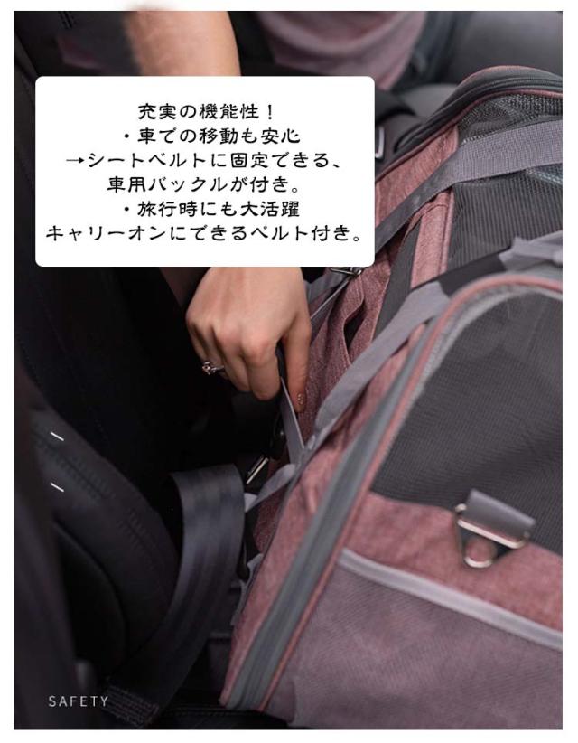 | ふかふかのマット付きで快適♪ 折り畳み式2WAYペットキャリーバッグ 3つのポケット付き ◎選ばれる6つのポイント◎ 【1、くつろげる広々空間】 ・窮屈さを感じさせず、ワンちゃんネコちゃんががゆったりくつろげます◎ ・サイズ:(約)幅51cm×奥行23cm×高さ35cm 丈夫でしっかり、安定感が抜群です◎ ・ふかふかのマット付きで、ワンちゃんネコちゃん快適♪ ・カバーは、外してお洗濯が可能。ずっと衛生的に使えます◎ ・飛び出し防止用リード付きで安心。 【2,出入りがスムーズ】 上部と左右、どの位置からも出入りが可能。 抱っこしたままでも、スムーズに入れられます。 ・キャリーバッグに入るのが苦手なワンちゃん、ネコちゃんにもおすすめ◎ 【3,通気性が抜群】 丈夫なメッシュ素材で、通気性が抜群。 暑い季節も、安心してお出掛けができます。 引っ掻き傷にも強い、丈夫な素材◎ ・3つの便利なポケット付きで、リードやおやつ、診察券などをサッと取り出せる◎ ・コード穴付きで、やイヤホンなどのコードも通せます◎ 【4,中の様子がわかりやすい】 前後左右から、いつでも中の様子をすぐに確認できる。 移動中も安心です◎ 【5,折り畳みが可能】 使わない時は、折り畳んでコンパクトに収納可能。 置き場所にも困りません。 【6,2WAYで移動がラクラク】 手持ち・ショルダーの2WAY仕様。 シーンに合わせた使い方ができます。 ・手が痛くなりにくい、丈夫な持ち手 ・肩への負担が少ない、ショルダーベルト 充実の機能性! ・車での移動も安心 →シートベルトに固定できる、車用バックルが付き。 ・旅行時にも大活躍 キャリーオンにできるベルト付き。 ◎◎こんなシーンにおすすめ◎◎ ・一緒のお出掛けに ・通院に ・ドライブに ・災害時の備えとして | |