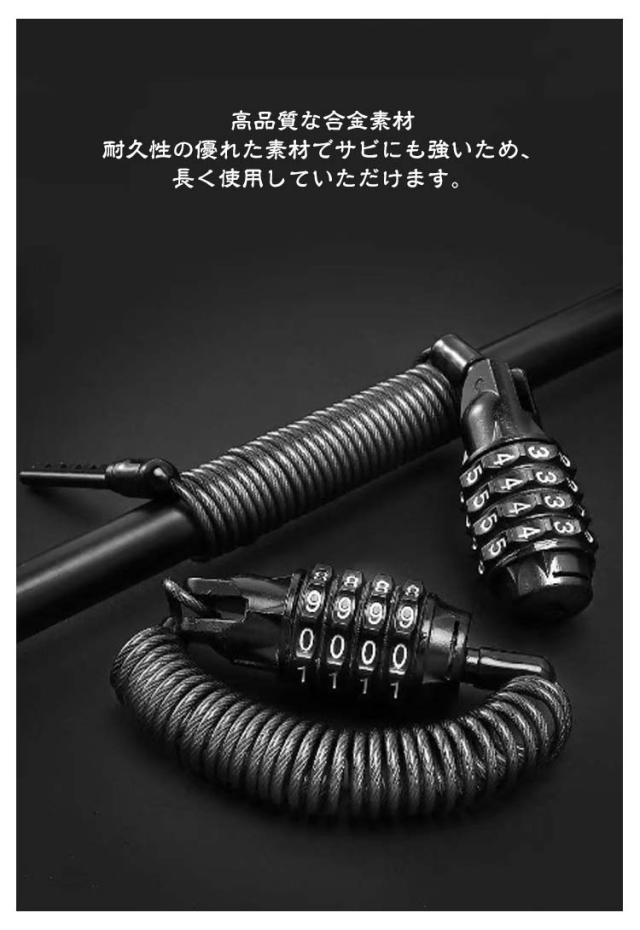 | 【2個セット】 【専用ブラケット付き】 自転車・ヘルメット専用 小穴も通れる | 4桁暗証番号 | 150cm 伸縮式 | 手のひらサイズ 大切な自転車/ヘルメットを守るために! ダイヤル式ワイヤーロック 高品質な合金素材 耐久性の優れた素材でサビにも強いため、長く使用していただけます。 高強度な先端部分 高度亜鉛合金ロック、丈夫で耐久性があり、安全で盗難防止、防腐防錆。 伸縮性あるワイヤー 柔軟性も高く様々な自転車に対応します。 軽量でコンパクトですので、持ち運びにも便利! 「ロングサイズ。」 ・ワイヤー長さは、の1,500mm。 ロングサイズだからこそ、フェンスなどへの設置も簡単。 使って納得、持ってて。固定しやすいケーブルロックです。 「高い性。」 ・カギ不要の4桁ダイヤル方式を採用。 防犯性が高く解除される心配も少ないので、&。 デザイン性にもこだわった、便利なケーブルロックです。 「専用ブラケット付き」 ・サドル等への取付けが可能になる専用ブラケットを付属。 装着したまま走行可能なので、どこかになくすこともありません。 〔暗証番号の設定方法〕 1.ダイヤルを初期パスワードの「0000」に合わせ、 カギを解除。 2.内部ダイヤルを矢印方向に90°回転。 (カチッと音がします) 3.数字ダイヤルを中央マークのところにまで回して、 お好みの番号をセット。 4.内部ダイヤルを矢印とは反対の方向へとまわせば、 セット完了です。 | |