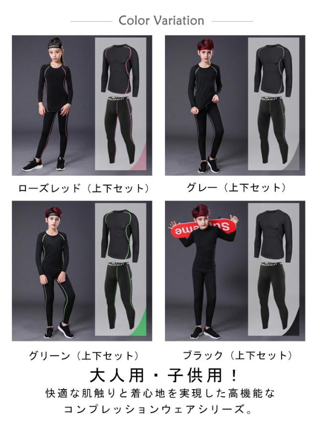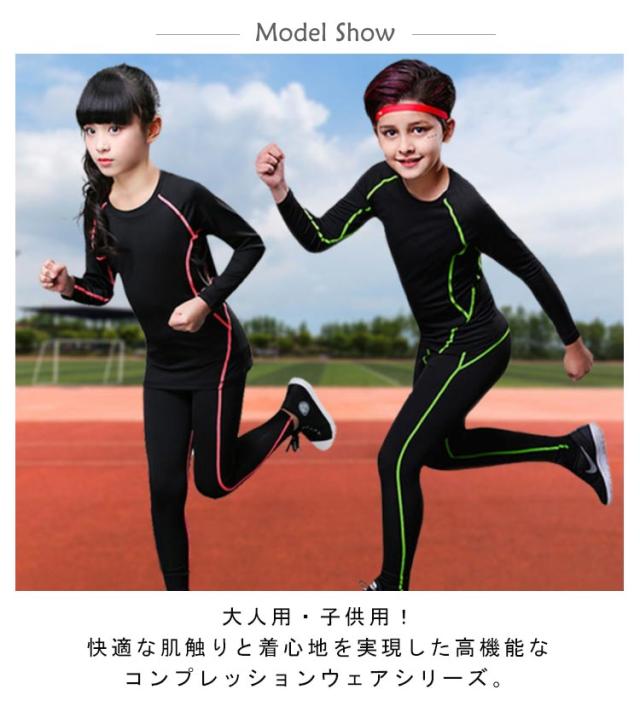 | 大人用・子供用!快適な肌触りと着心地を実現した高機能なコンプレッションウェアシリーズ。 子ども用スポーツウェアセット。様々なスポーツに最適!着心地の良さと機能性を備えたウェアは様々なスポーツやフィットネスにピッタリです。 アスリートのパフォーマンスを最大限に引き出す4方向のパワーストレッチ素材でボディにぴったりフィット。 汗を素早く吸収、発散するクールドライ加工、抗菌防臭加工、ストレッチ性と吸汗速乾性に優れた素材でサラッとした快適な着心地のスポーツインナー。 ストレッチ性に優れ、洗濯時の激しい色落ちがありません。 スポーツ、トレーニング時にコンプレッションウェア、アンダーシャツを着用することにより、筋肉の振動や、揺れを防ぎ、筋肉疲労を軽減します。 | |
