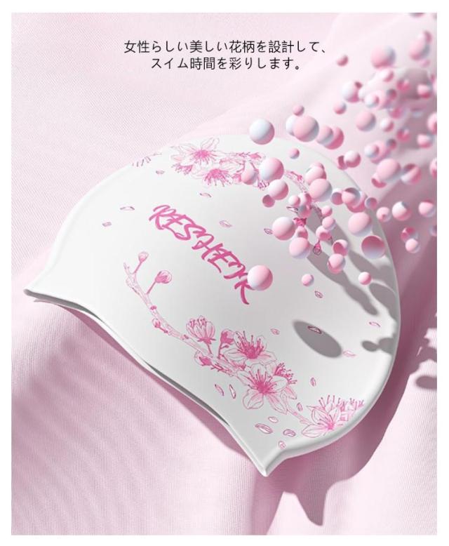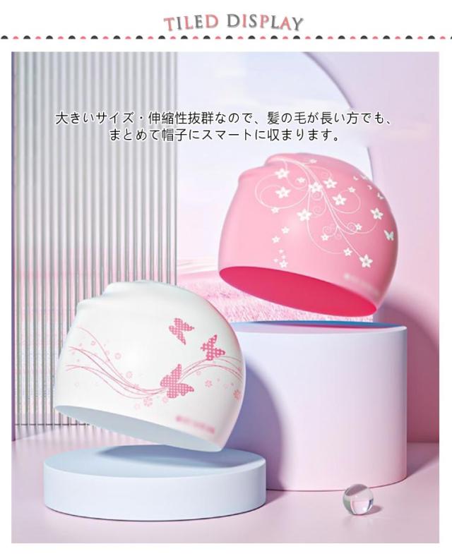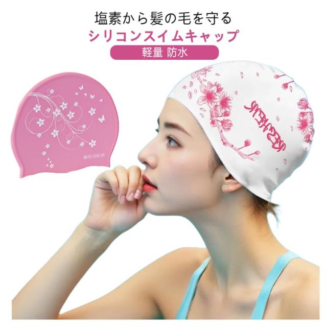 | 塩素から髪の毛を守るシリコンスイムキャップ 大きいサイズ・伸縮性抜群なので、髪の毛が長い方でも、まとめて帽子にスマートに収まります。 シリコン素材を用いており、頭にピッタリとフィットするので、水の抵抗を受けにくく、髪が濡れにくいので髪や頭皮を塩素から守ってくれます。 女性らしい美しい花柄を設計して、スイム時間を彩りします。 水中ウォーキングなどのトレーニングや、キッズスイミングの付き添い、ベビースイミングなど、普段のプールで大活躍! | |