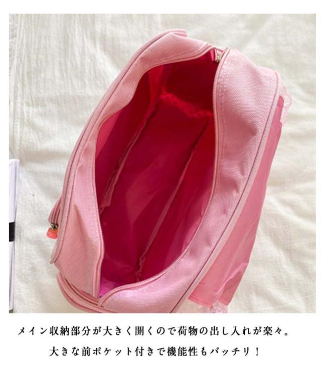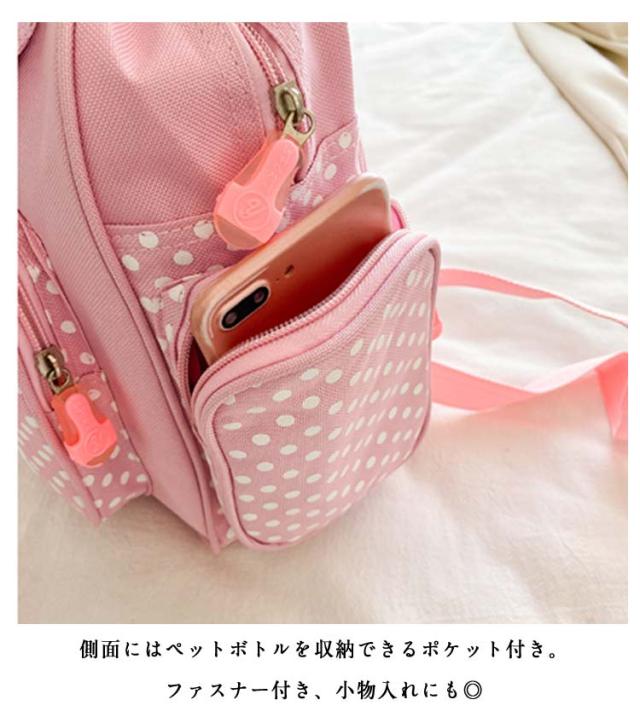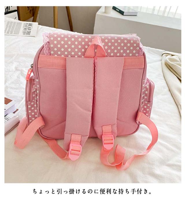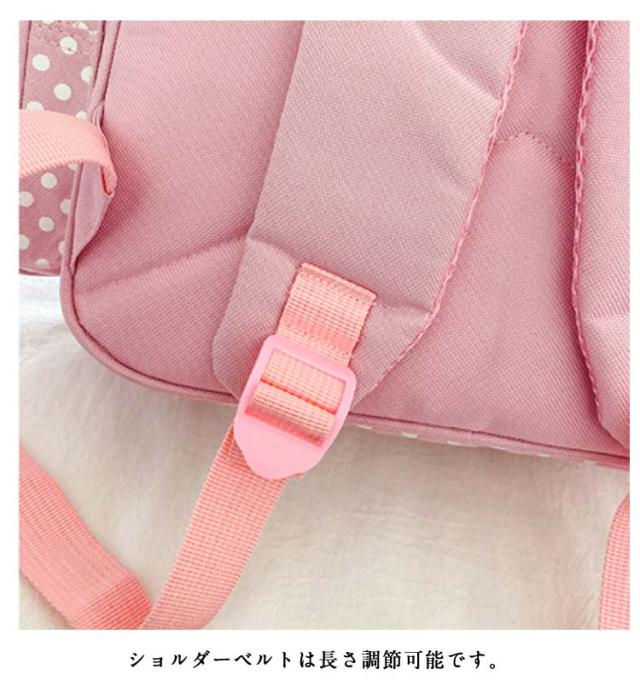 | 甘いデザインのリュックサック 側面にはペットボトルを収納できるポケット付き。ファスナー付き、小物入れにも◎ お出かけやお散歩にもぴったり! ちょっと引っ掛けるのに便利な持ち手付き。 ショルダーベルトは長さ調節可能です。 メイン収納部分が大きく開くので荷物の出し入れが楽々。 大きな前ポケット付きで機能性もバッチリ! | |