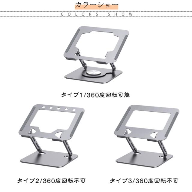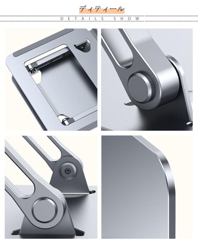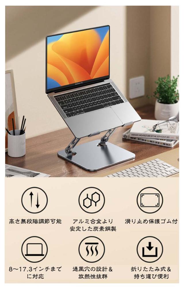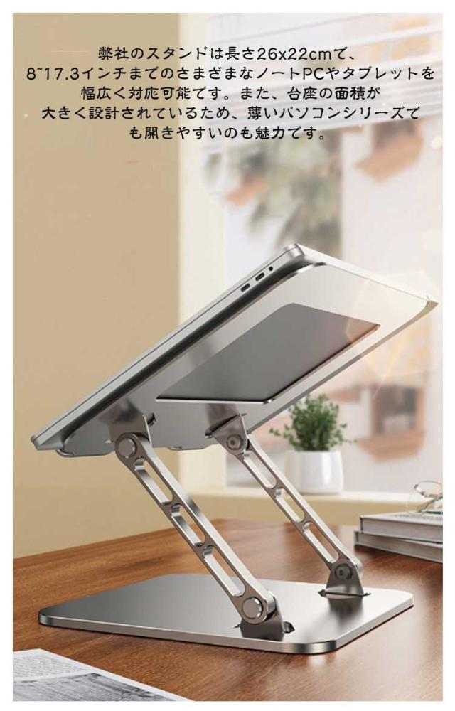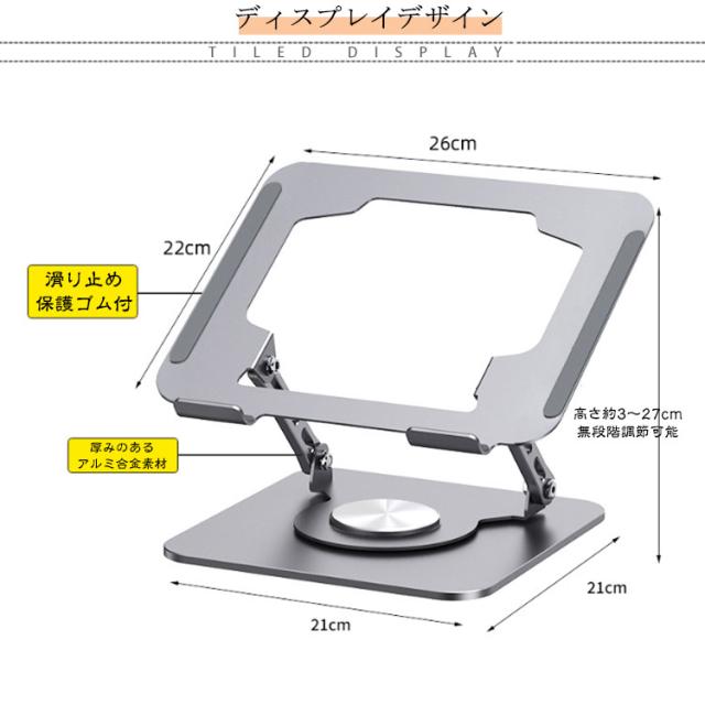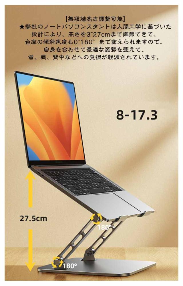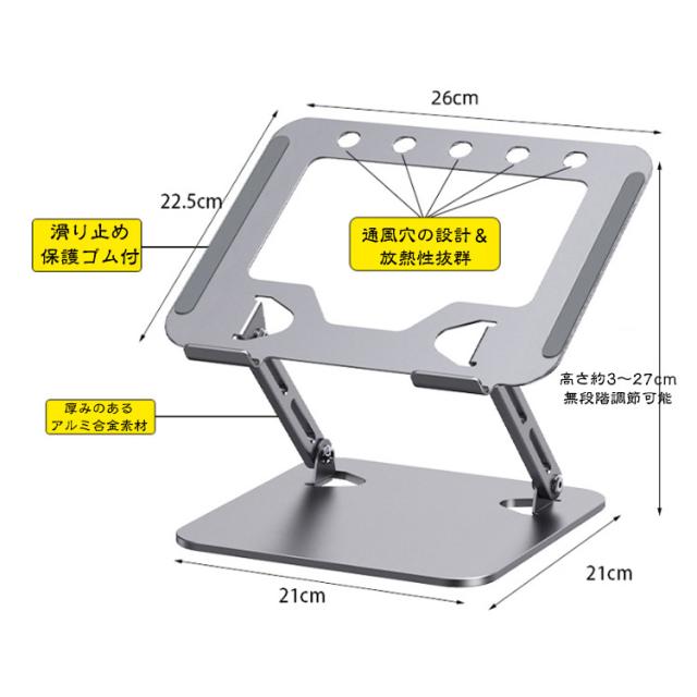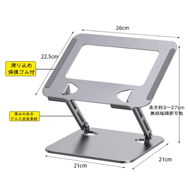 | 高さ約3〜27cm無段階調節可能 360°回転可能 180°角度調整可能 炭素鋼製で安定性抜群! ノートパソコンスタンド 【無段階高さ調整可能】 ★弊社のノートパソコンスタントは人間工学に基づいた設計により、高さを3~27cmまで調節できて、台座の傾斜角度も0~180°まで変えられますので、自身を合わせて最適な姿勢を整えて、首、肩、背中などへの負担が軽減されています。 ★回転軸部分は耐腐食性を高めるアルマイト処理で、摩擦に強く、角度や高さが自由自在に調整可能ですが安定感も抜群。 ★PC作業時に自分に合う高さや角度に調節するため、悪い姿勢になり身体になりがちです。一番気持ち良い姿勢を保ち、長時間のPC作業も苦 にならず、集中力も高まり作業効率UP。 【優れた安定性&幅広い互換性】 ノートパソコンスタンド本体はアルミ合金より安定した炭素鋼素材で加工されるため、20kg以内の重量まで耐えられます。なお、低重心設計に加え、Z型デザインにする事でスタンドの安定性を向上させているので、タイピング時の不快な揺れを最小限に抑えられています。弊社のスタンドは長さ26x22cmで、8~17.3インチまでのさまざまなノートPCやタブレットを幅広く対応可能です。また、台座の面積が大きく設計されているため、薄いパソコンシリーズでも開きやすいのも魅力です。 【通風穴の設計&放熱性抜群】 本ノートパソコンスタンドは熱伝導性が優れている炭素鋼製で、熱によるパソコンの動作自体が強制終了するトラブルを防ぐことができます。ノートパソコンとの接触面に通風穴を設けて、空気の流動性と放熱性を向上させているので、パソコンなどのデバイスの使用寿命を延ばし、ノートパソコンはより速く運行することができます。 夏場の熱暴走対策にも活躍します。 【持ち運び便利&滑り止め保護ゴム付】 ★折りたたみ式ノートパソコンスタンドなので、簡単に折畳ってカバンの中に収納して持ち運べてでかけて、カフェや新幹線、飛行機移動中、出張、展示会など様々シーンに活躍できます。PCスタンド下にキーボードなどを収納できて、デスクスペースを有効に活用します。使わない時に折畳って隣に置いて邪魔しないです。 ★パソコンが当たる部分にはシリコンゴム製の滑り止めが施されているので落下の心配なく使用が可能。スタンド接地側も滑り止めが付いているので、デスク | |
