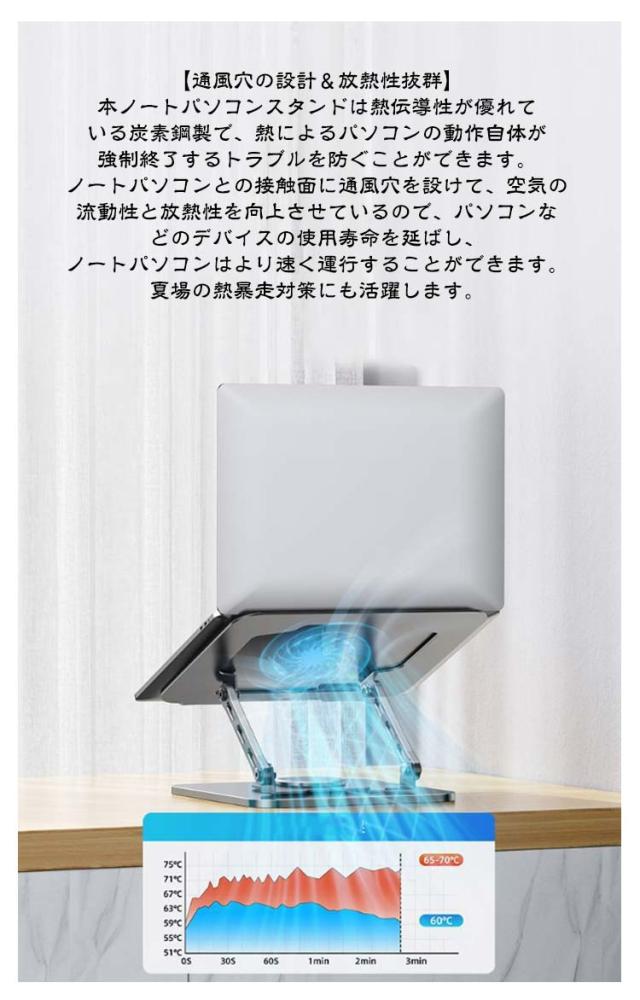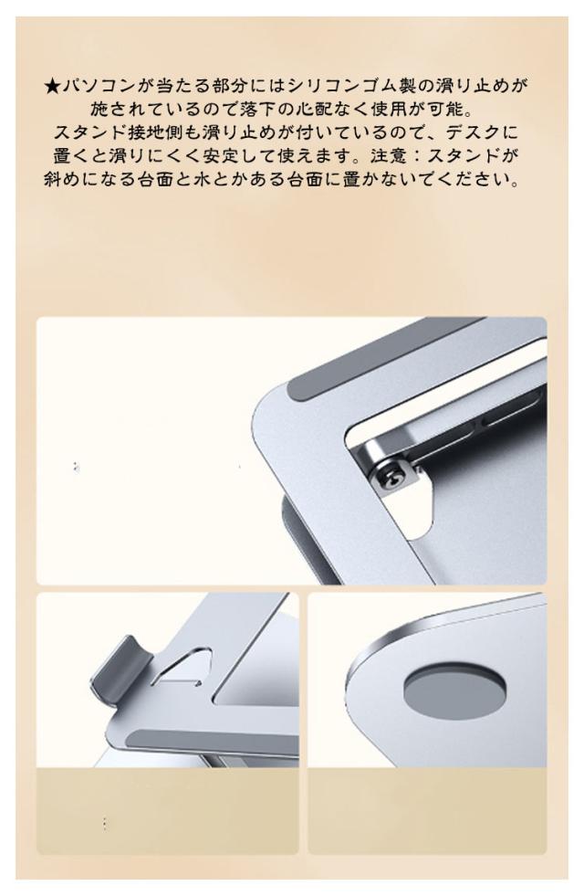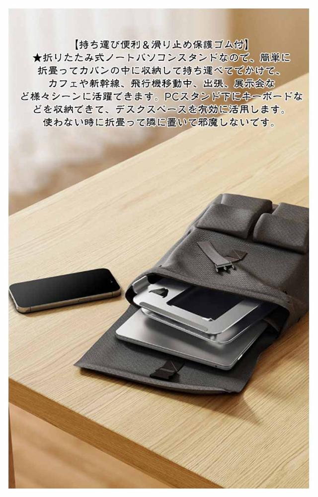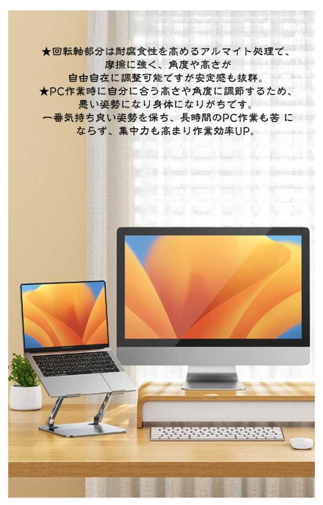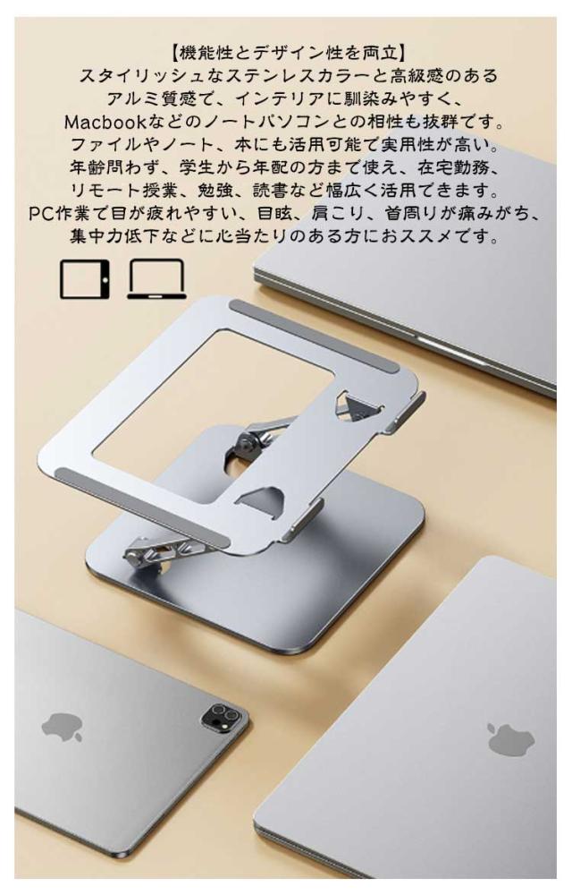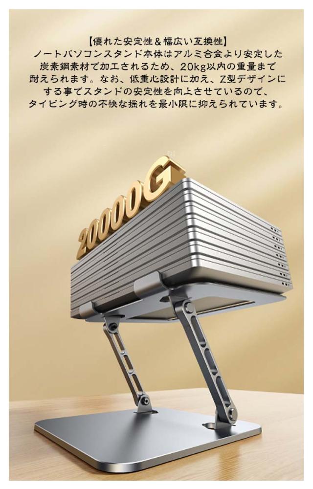 | 高さ約3〜27cm無段階調節可能 360°回転可能 180°角度調整可能 炭素鋼製で安定性抜群! ノートパソコンスタンド 【無段階高さ調整可能】 ★弊社のノートパソコンスタントは人間工学に基づいた設計により、高さを3~27cmまで調節できて、台座の傾斜角度も0~180°まで変えられますので、自身を合わせて最適な姿勢を整えて、首、肩、背中などへの負担が軽減されています。 ★回転軸部分は耐腐食性を高めるアルマイト処理で、摩擦に強く、角度や高さが自由自在に調整可能ですが安定感も抜群。 ★PC作業時に自分に合う高さや角度に調節するため、悪い姿勢になり身体になりがちです。一番気持ち良い姿勢を保ち、長時間のPC作業も苦 にならず、集中力も高まり作業効率UP。 【優れた安定性&幅広い互換性】 ノートパソコンスタンド本体はアルミ合金より安定した炭素鋼素材で加工されるため、20kg以内の重量まで耐えられます。なお、低重心設計に加え、Z型デザインにする事でスタンドの安定性を向上させているので、タイピング時の不快な揺れを最小限に抑えられています。弊社のスタンドは長さ26x22cmで、8~17.3インチまでのさまざまなノートPCやタブレットを幅広く対応可能です。また、台座の面積が大きく設計されているため、薄いパソコンシリーズでも開きやすいのも魅力です。 【通風穴の設計&放熱性抜群】 本ノートパソコンスタンドは熱伝導性が優れている炭素鋼製で、熱によるパソコンの動作自体が強制終了するトラブルを防ぐことができます。ノートパソコンとの接触面に通風穴を設けて、空気の流動性と放熱性を向上させているので、パソコンなどのデバイスの使用寿命を延ばし、ノートパソコンはより速く運行することができます。 夏場の熱暴走対策にも活躍します。 【持ち運び便利&滑り止め保護ゴム付】 ★折りたたみ式ノートパソコンスタンドなので、簡単に折畳ってカバンの中に収納して持ち運べてでかけて、カフェや新幹線、飛行機移動中、出張、展示会など様々シーンに活躍できます。PCスタンド下にキーボードなどを収納できて、デスクスペースを有効に活用します。使わない時に折畳って隣に置いて邪魔しないです。 ★パソコンが当たる部分にはシリコンゴム製の滑り止めが施されているので落下の心配なく使用が可能。スタンド接地側も滑り止めが付いているので、デスク | |