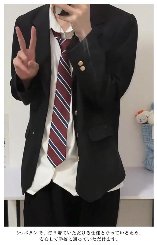 | 【セット内容】ジャケット+長袖シャツ+ズボン+ネクタイ 制服のない中学高校の通学・卒業式・入学式におすすめ、男子用制服スクールブレザーです。 ウォッシャブル加工。汗やニオイが気になる人にはうれしいウォッシャブル!ご家庭で丸洗いが可能な機能素材を使用しています。さらに撥水性・耐久性・抗菌防臭加工までされているので、汚れにも強いです。 深めの襟やステッチが特徴で、よりスクールらしいディティールとなっており、ネクタイなどの相性もばっちり。 独特シャープなシルエットの男子用制服ブレザーです。3つボタンで、毎日着ていただける仕様となっているため、安心して学校に通っていただけます。 | |