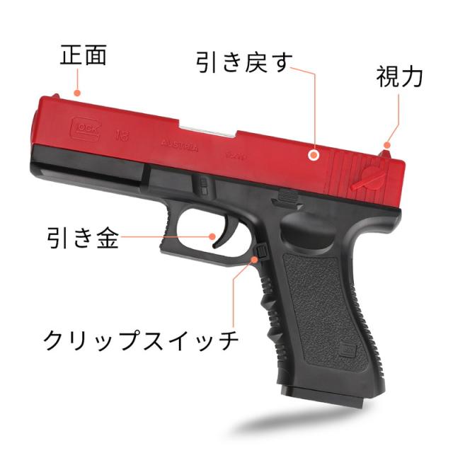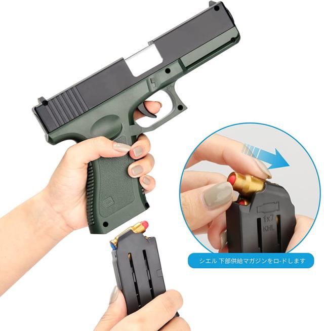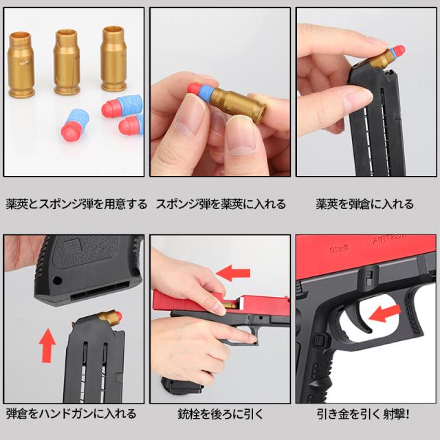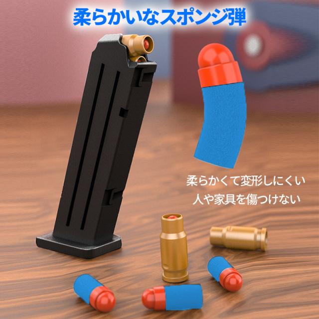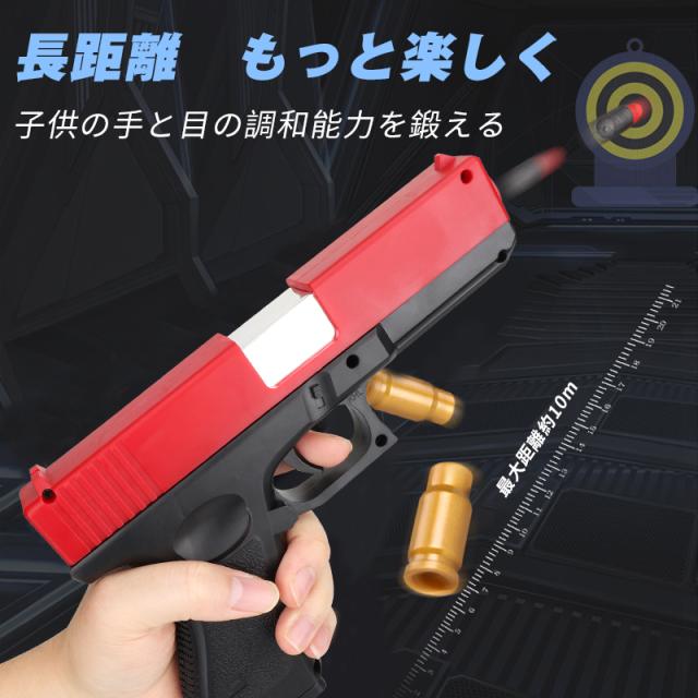 【子供向けに設計】安全を念頭に置いて子供向けに設計されたおもちゃの銃。20個の柔らかい弾丸と16個薬莢を含みます。柔らかい弾丸は、無害な衝撃で8メートルの範囲で撃たれます。重さは約630gと軽くて手軽なハンドガンモデルです。
