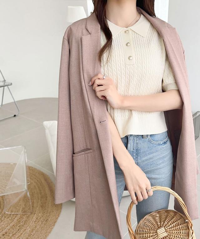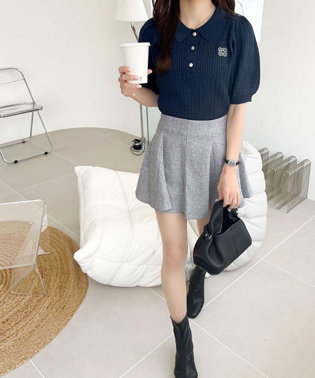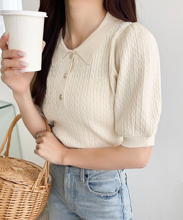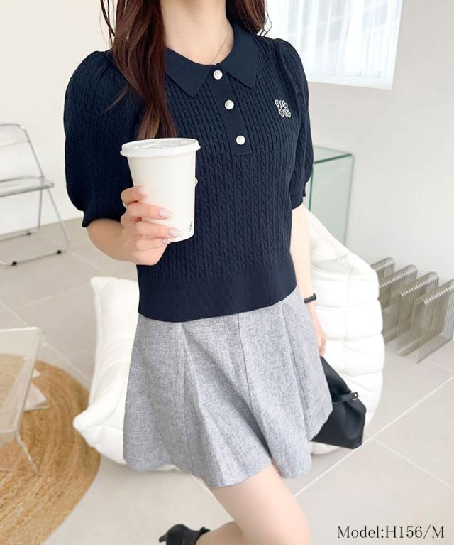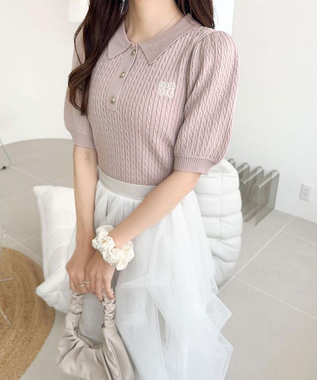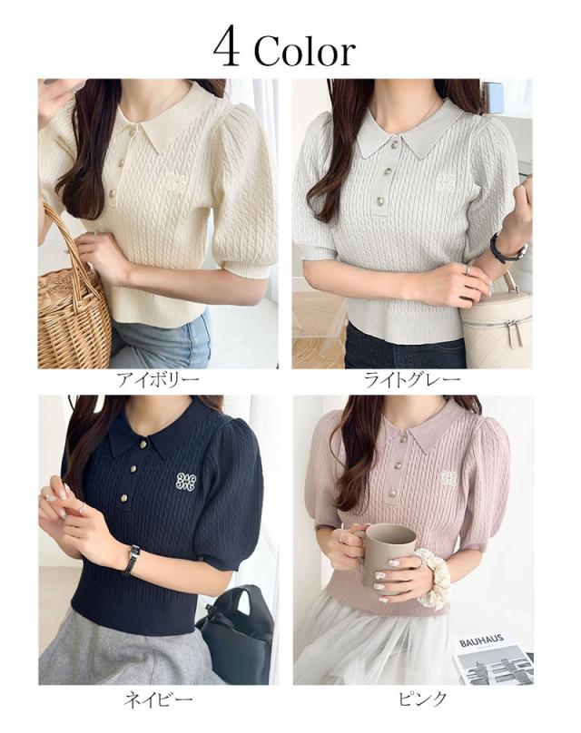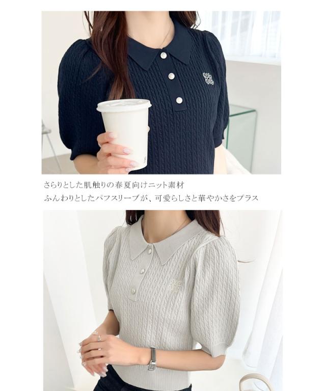 ★【mily bilet】きちんと上品大人キュート。胸刺繍ケーブルニットパフスリーブポロシャツ(半袖)★