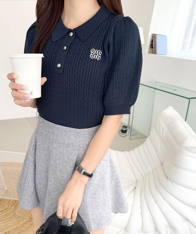 クラシカルエルフ冬新作 mily bilet トップス ポロシャツ レディース ケーブルニット パフスリーブ 半袖 上品 大人 胸刺繍 きちんと エレガント シンプル 大きいサイズ 2025ss mi1029096