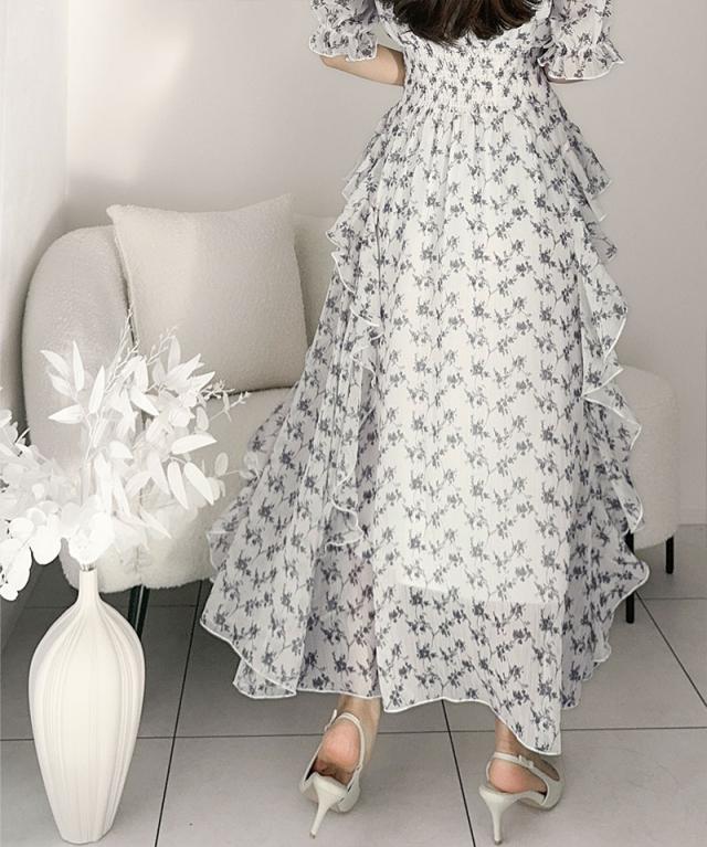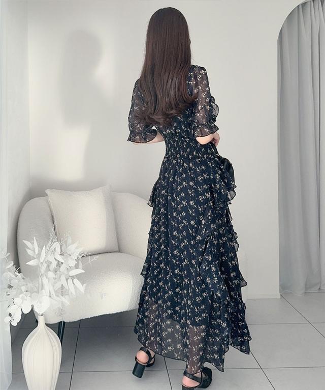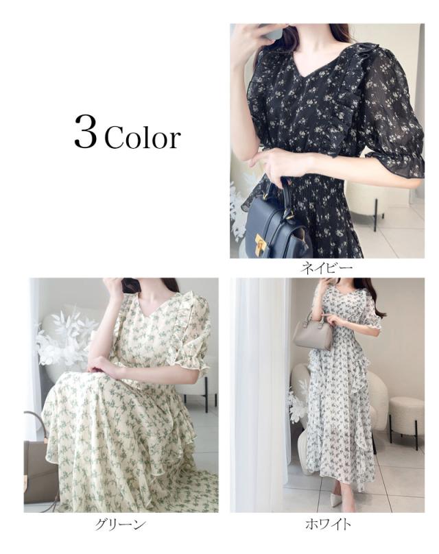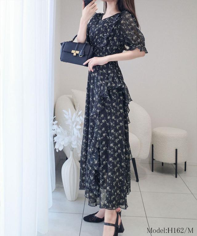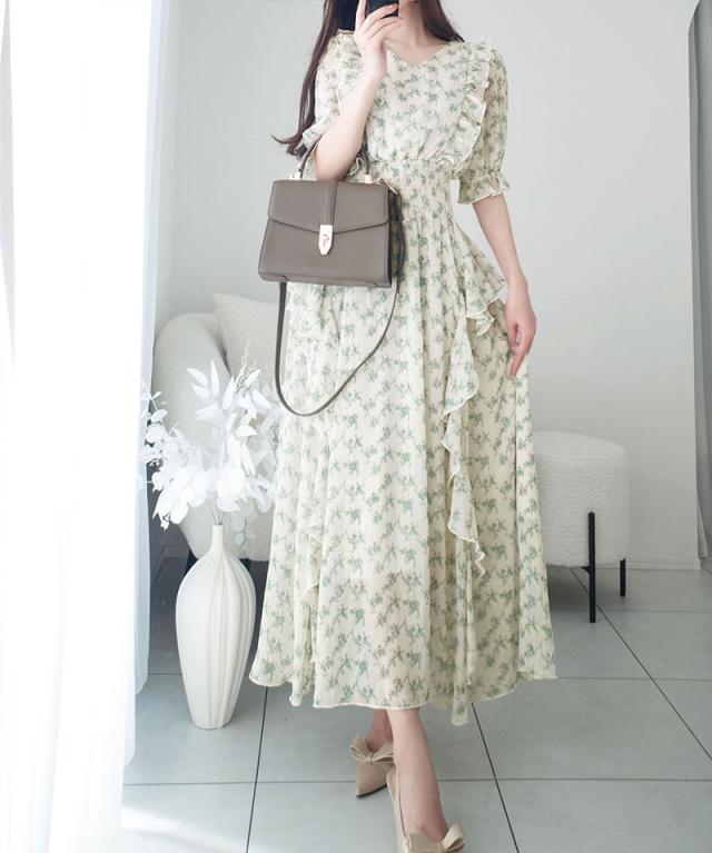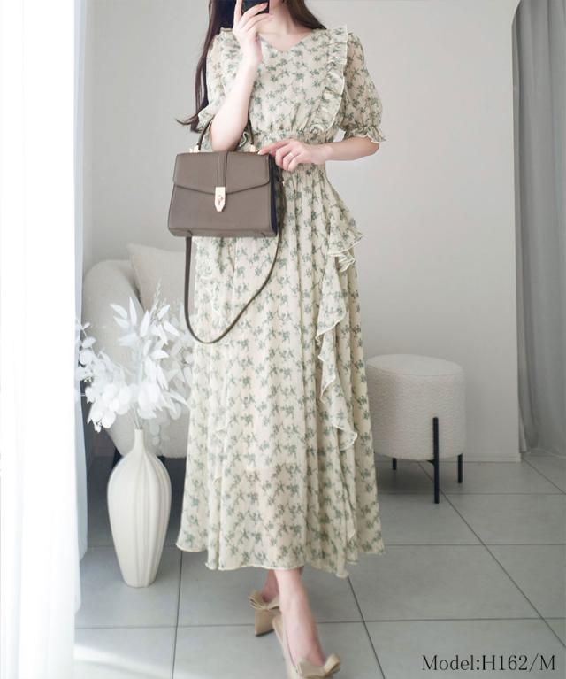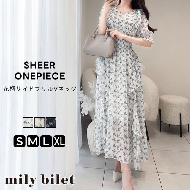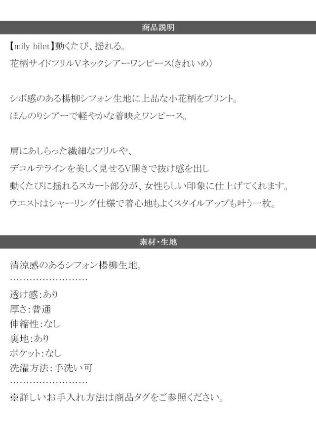 クラシカルエルフ冬新作 mily bilet ワンピース レディース 小花柄 サイド フリル V ネック シアー 素材 ワンピース きれいめ ウエスト シャーリング スタイルアップ 大きいサイズ 2025ss mi1139063