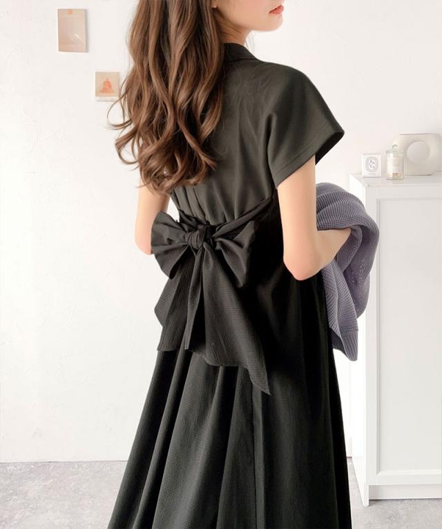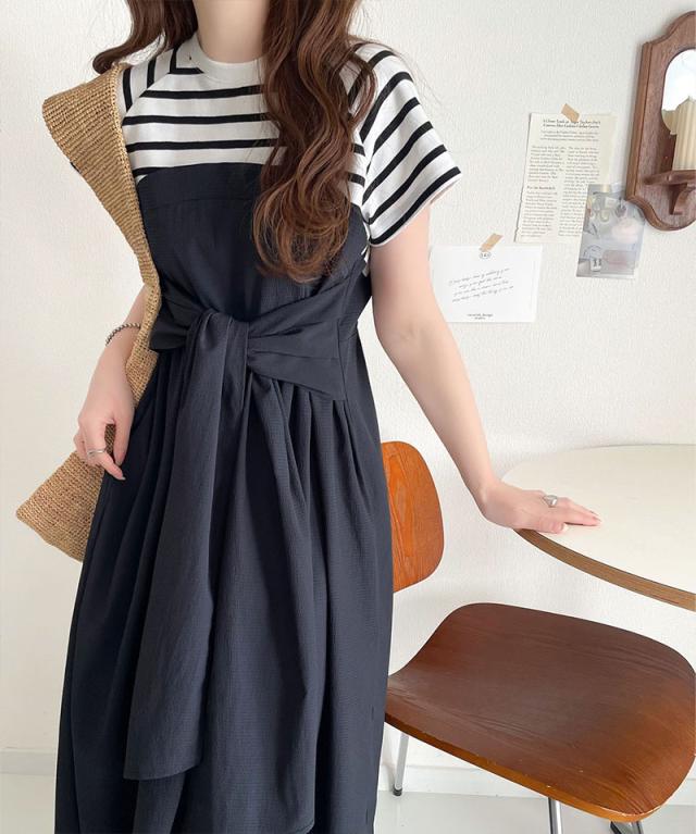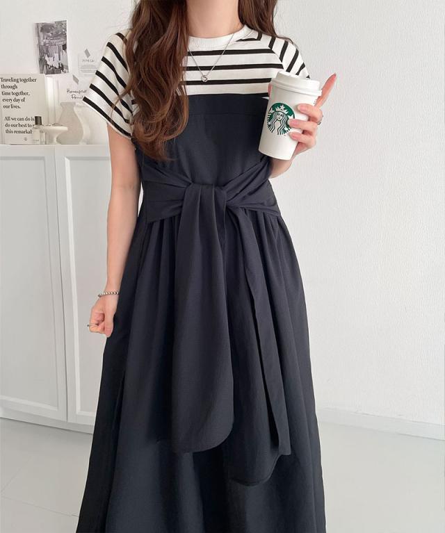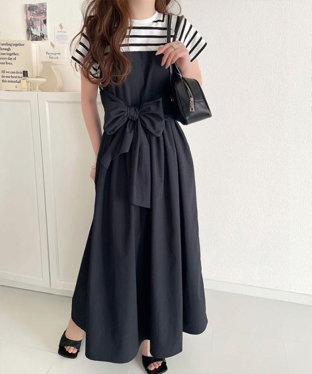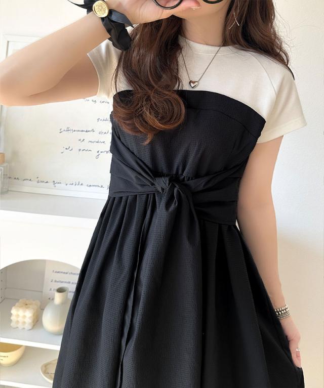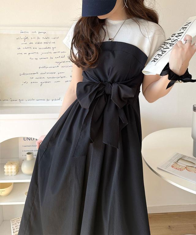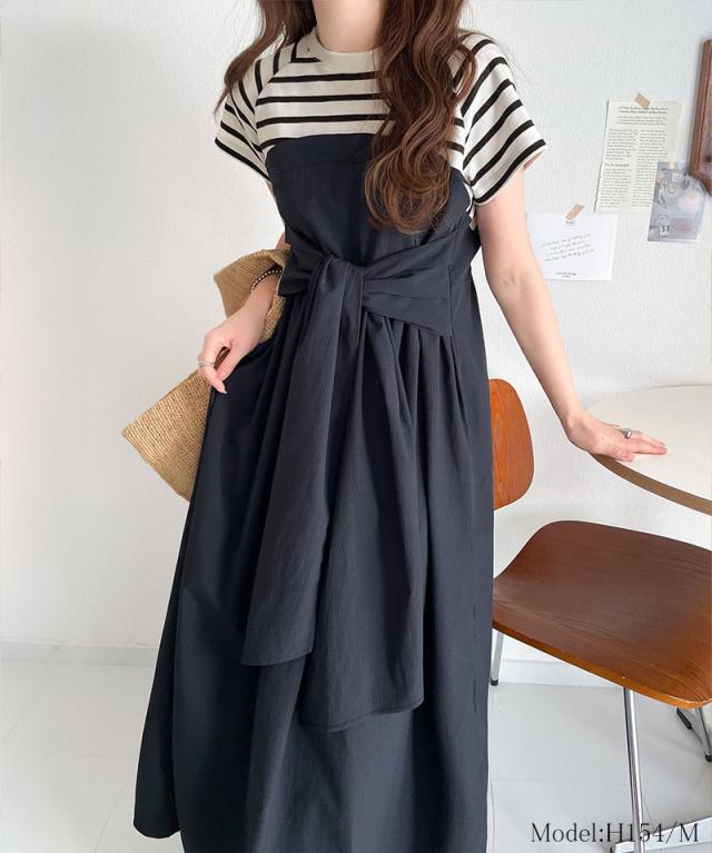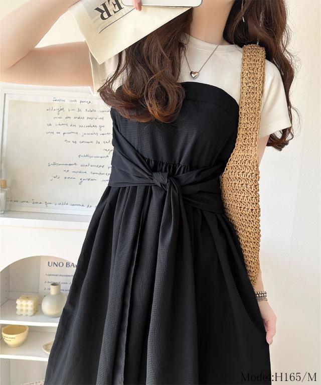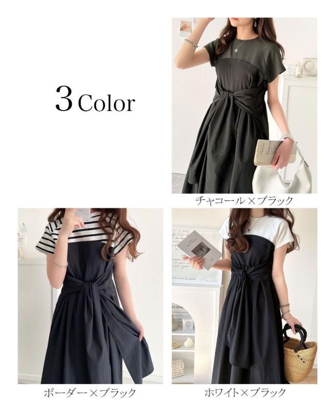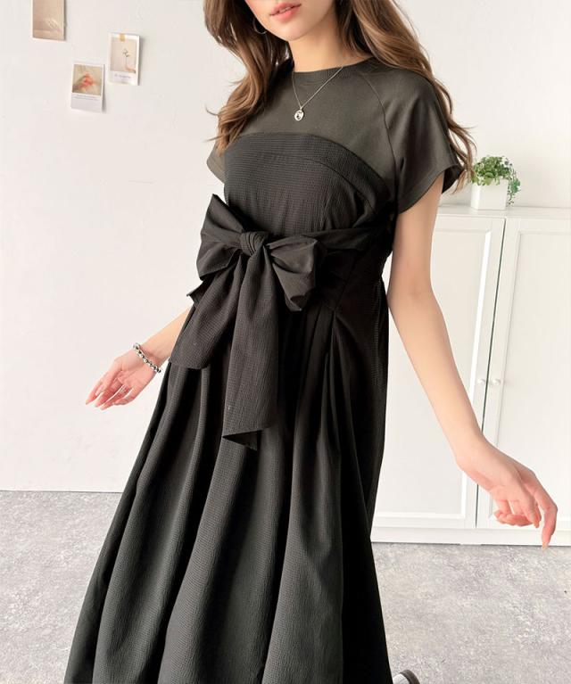 クラシカルエルフ冬新作 ワンピース レディース ビスチェ 風 2way 大きめ リボン 使い 凹凸感 サッカー 素材 ドッキング ロング ワンピ 半袖 レイヤードコーデ 風 大きいサイズ 2025ss ce1020194