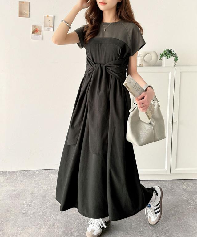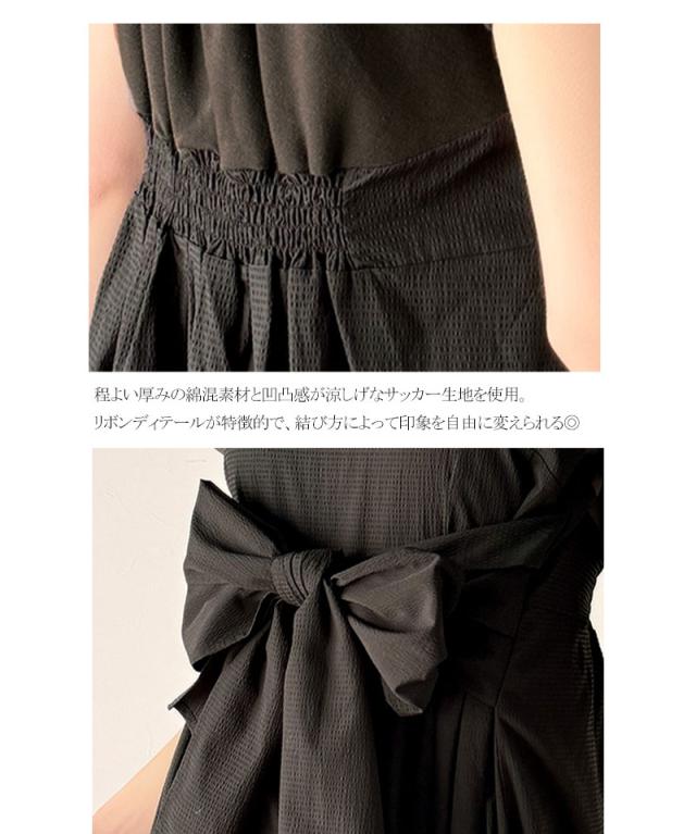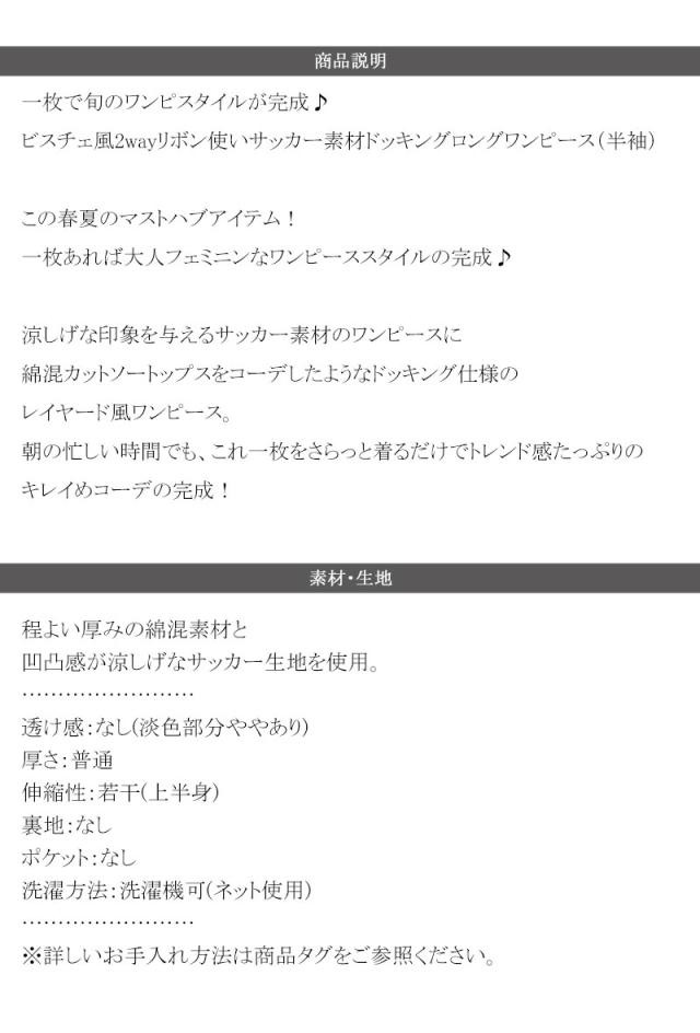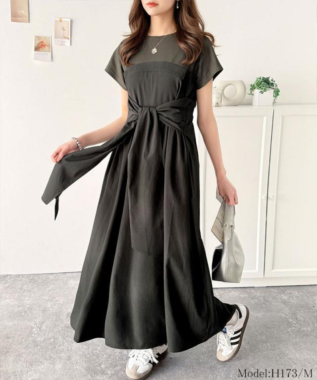 ★一枚で旬のワンピスタイルが完成♪ビスチェ風2wayリボン使いサッカー素材ドッキングロングワンピース(半袖)★