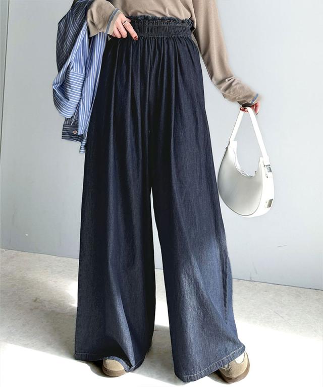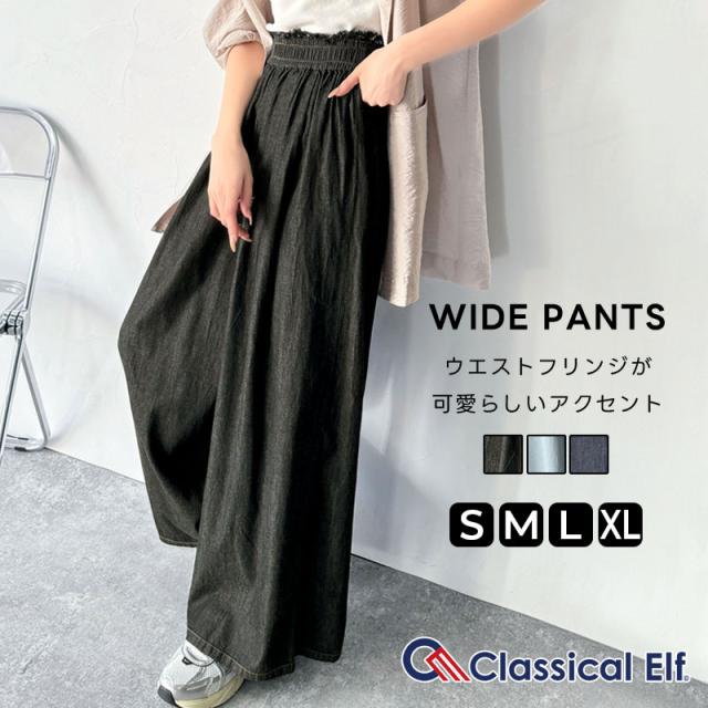 クラシカルエルフ冬新作 ボトムス パンツ レディース 綿 100% ライトオンス デニム 素材 ウエスト ゴム ヴィンテージ 風 フリンジ ワイドパンツ ゆるっと オーバーサイズ 大きいサイズ 2025ss ce0940218