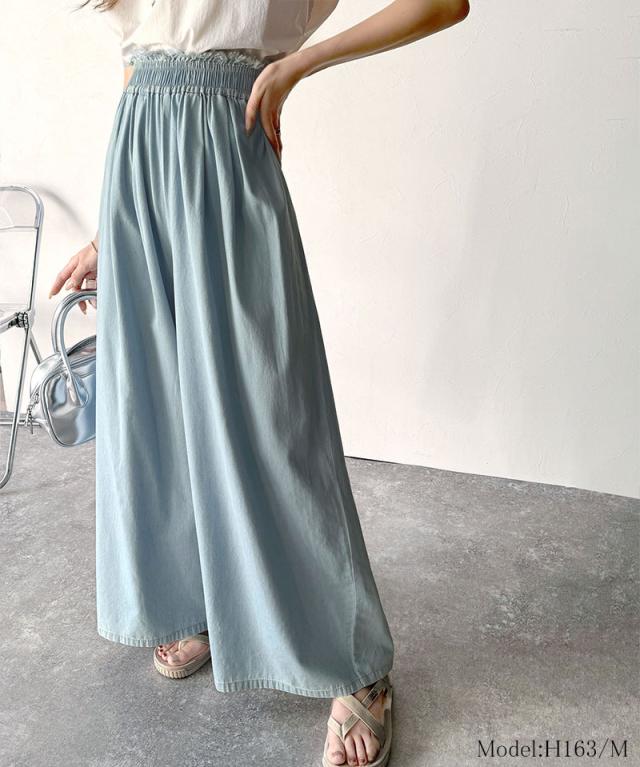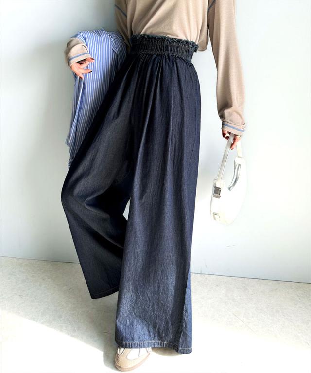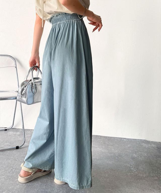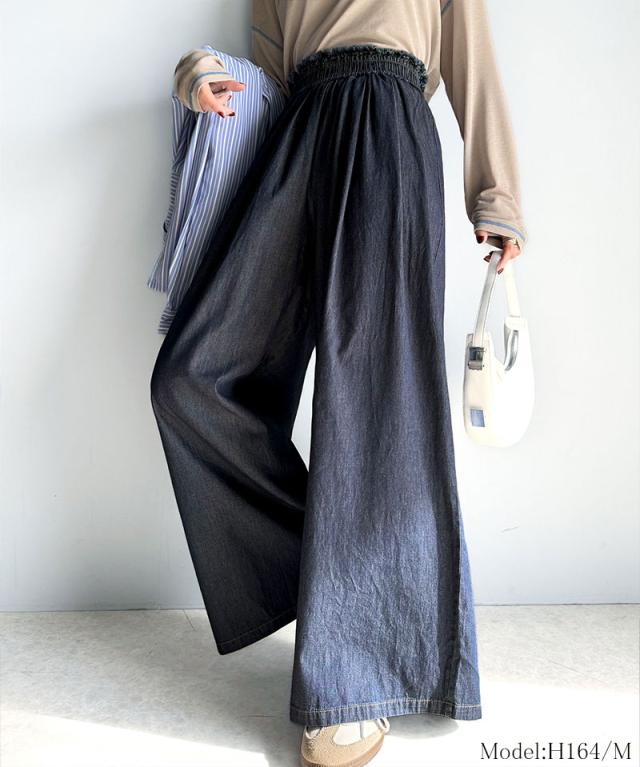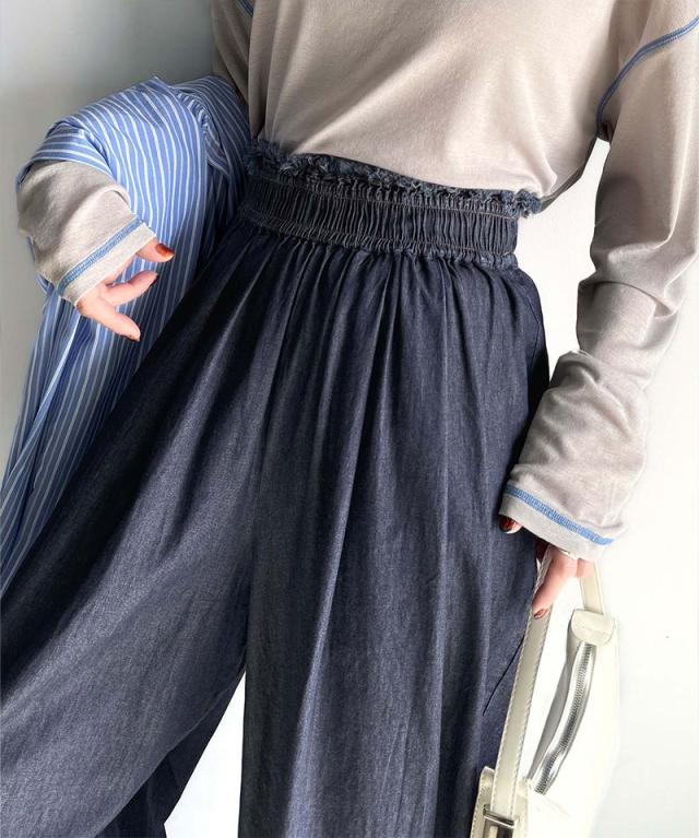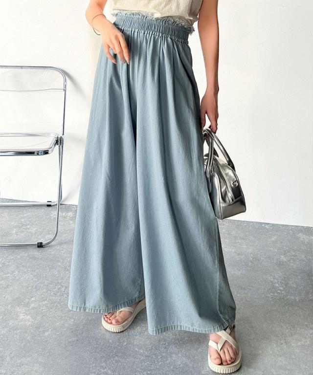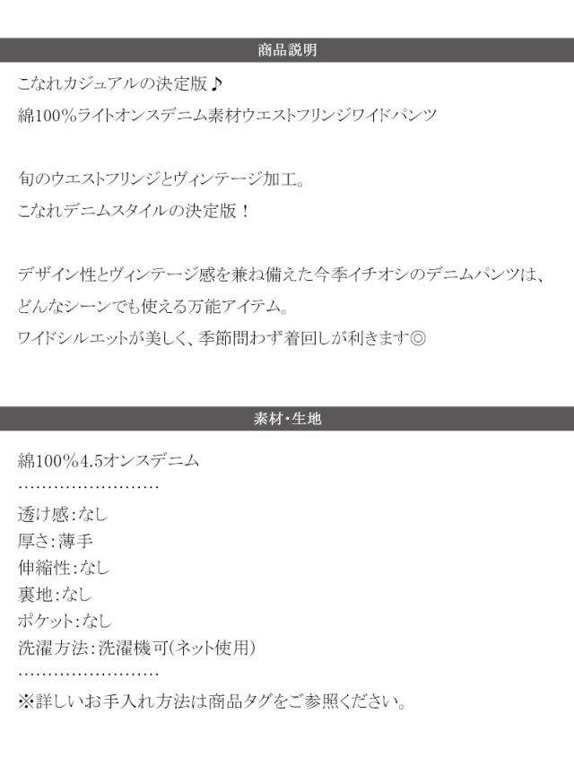 ★こなれカジュアルの決定版♪綿100%ライトオンスデニム素材ウエストフリンジワイドパンツ★