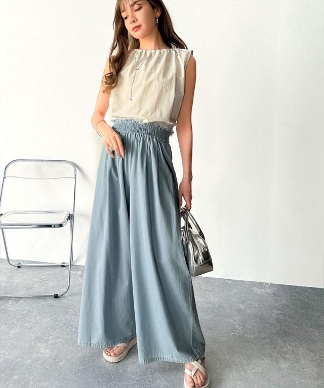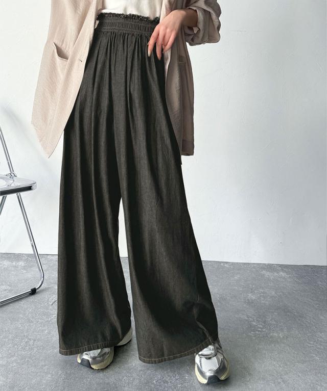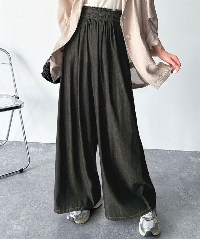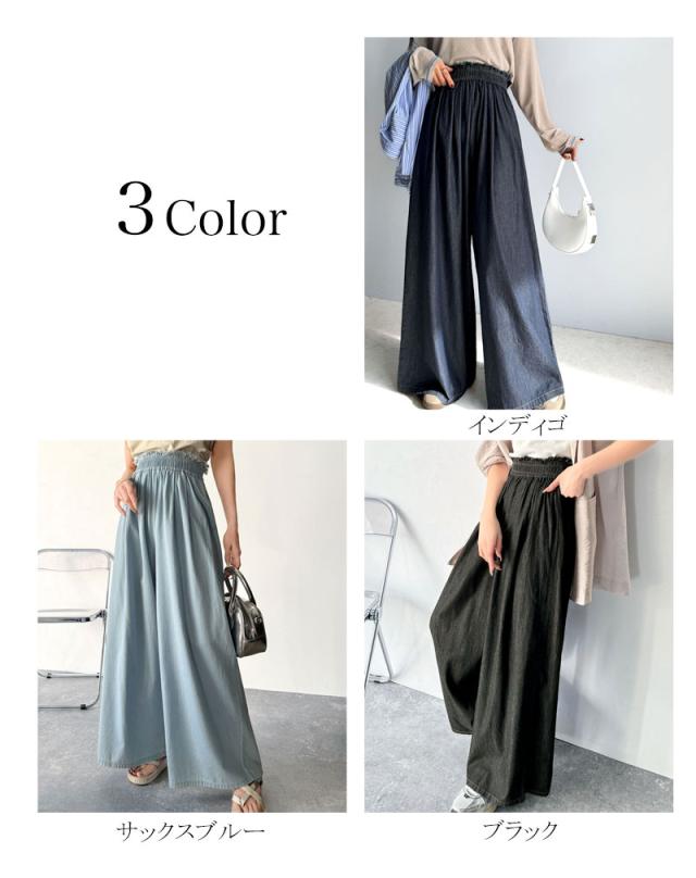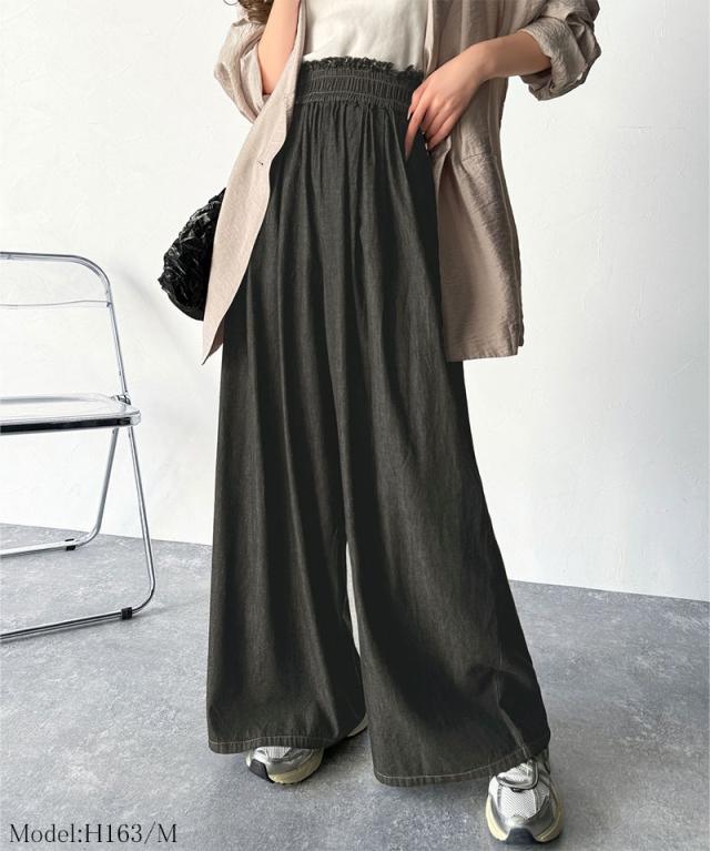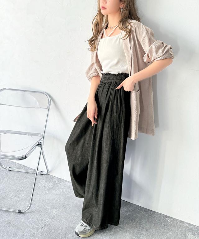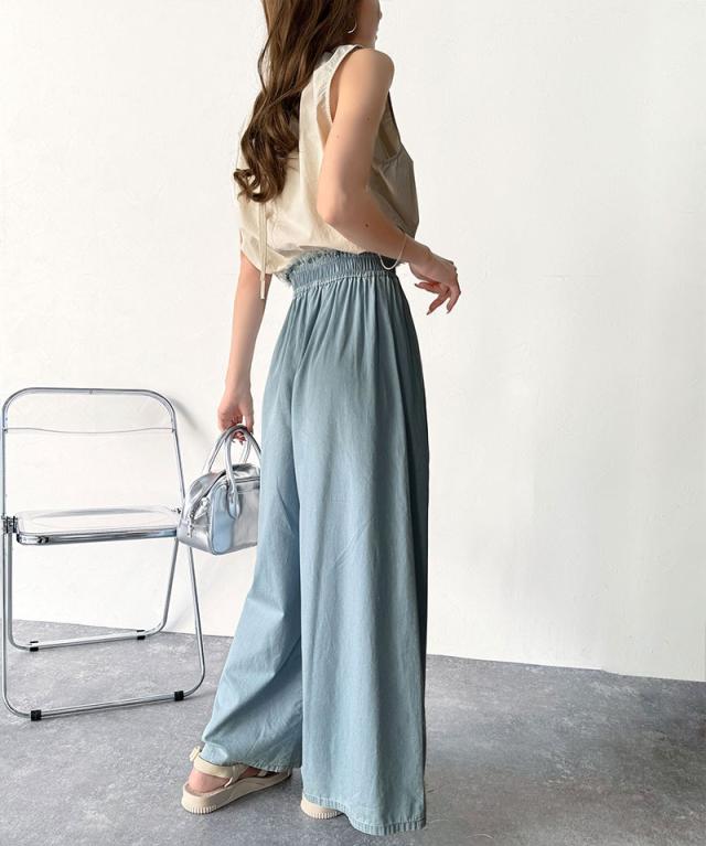 ★こなれカジュアルの決定版♪綿100%ライトオンスデニム素材ウエストフリンジワイドパンツ★