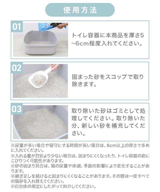 ・乳幼児やペットが触れない所に保管してください。 ・開封後は袋の口をしっかりと閉じ、湿気の少ない乾燥した場所に保管してください。 特に梅雨時期などには吸水、固化性能に影響を与える場合があるため、ご注意ください。 ・砂の固まり具合は、猫の尿量や体調、季節の影響により変化することがあります。 ・緑色の粒は抗菌粒で抗菌剤が入っています。 ・本製品は水に溶けません。つまりの原因になるため、水洗トイレや排水口にはながさないでください。 ・商品は、モニターによって色合いが異なって見える場合があります。 ・仕様・デザインは改良のため予告なく変更することがあります。 |