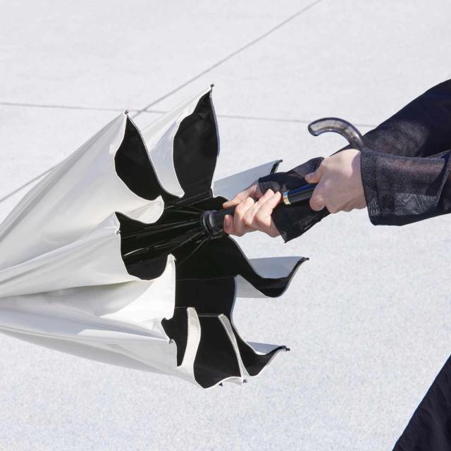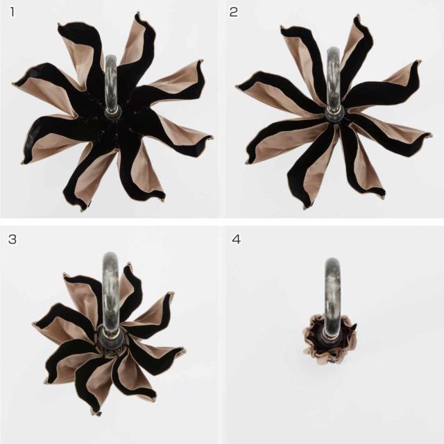 閉じる動きに連動して骨が回転し、軸を中心に生地がくるくると巻き込まれます。最後に手で生地をまとめたり、ベルトで留める必要がなく、素早く傘をたたむことができます。
