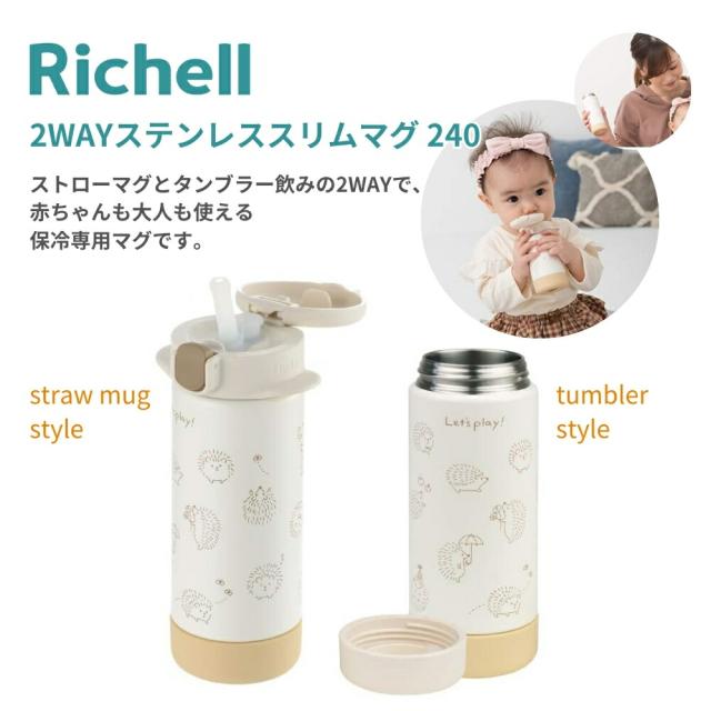 リッチェル 2WAY ステンレススリムマグ 240mL 保冷 マグ ベビー コップマグ ストローマグ 赤ちゃん 5カ月頃~ ストラップ マグセット 練習 持ち運び 水筒 ステンレス 食洗機