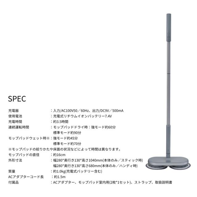 ・付属品:ACアダプター、モップパッド室内用(2枚*1セット)、ストラップ、取扱説明書