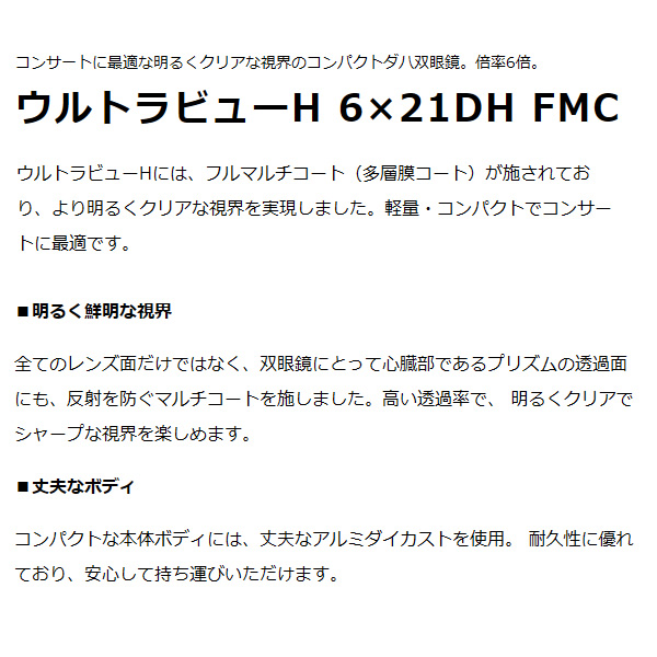 コンサートに最適な明るくクリアな視界のコンパクトダハ双眼鏡。倍率6倍。 ウルトラビューH 6×21DH FMC ■倍率:6倍 ■対物レンズ有効径:21mm ■コーティング:フルマルチコーティング ■実視界:8.5° ■1000m先の視野:148.6m ■ひとみ径:3.5mm ■明るさ:12.3 ■アイレリーフ:13.2mm ■最短合焦距離:3m ■目幅調整範囲:57〜72 ■サイズ(W×H×D):110×91×37mm ■重量:200g ■付属品:専用ポーチ、ストラップ、レンズクロス ※記載は商品仕様の一部です。仕様説明不足等の理由での返品はできません。特に適合等は必ずご確認ください。