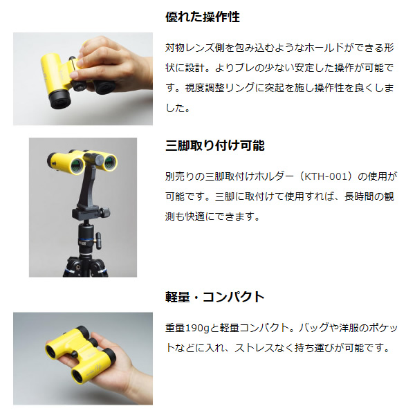 別売りの三脚取付けホルダー(KTH-001)の使用が可能です。三脚に取付けて使用すれば、長時間の観測も快適にできます。