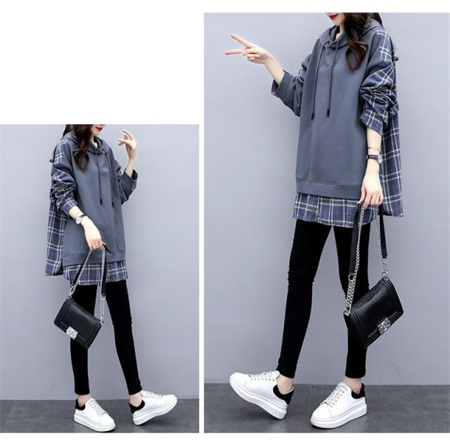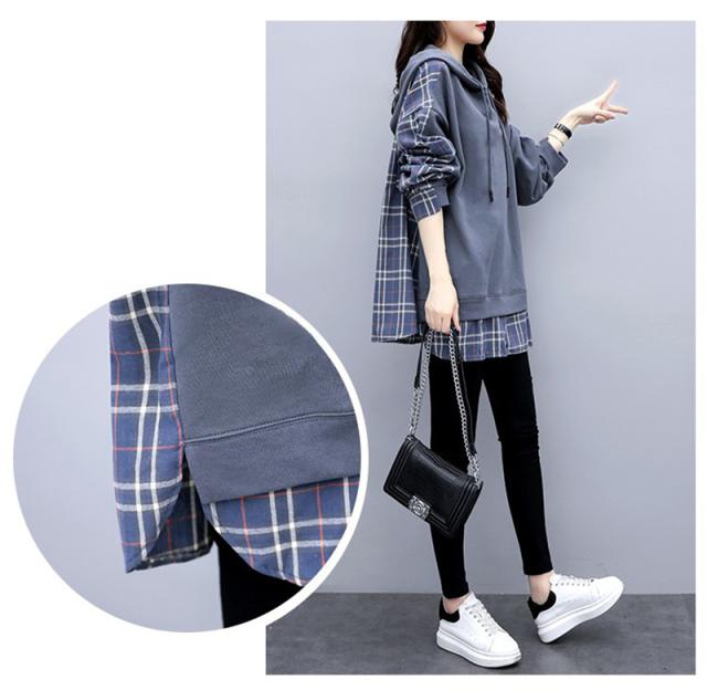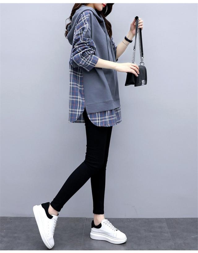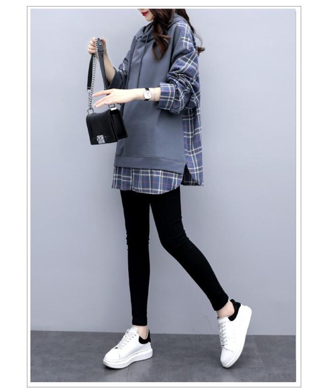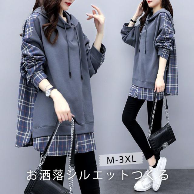 トレーナー パーカー レディース プルオーバー 重ね着風 フード付き スウェット 長袖 トップス 春秋 カジュアル おしゃれ ロング 秋 新作