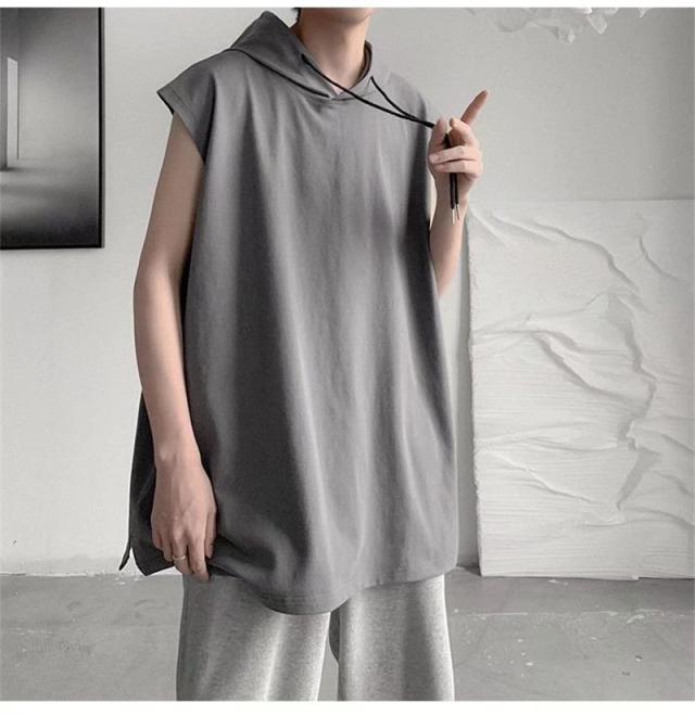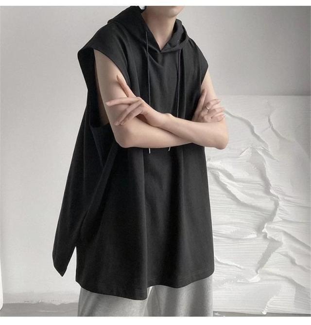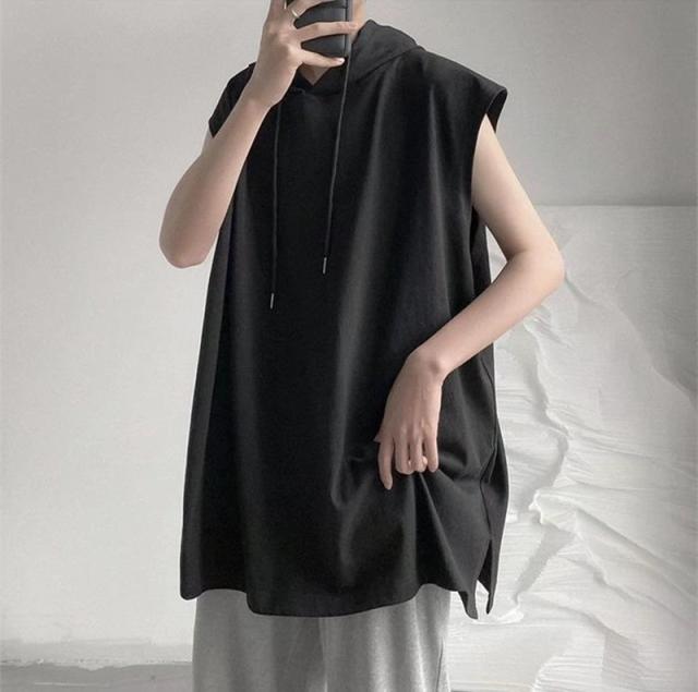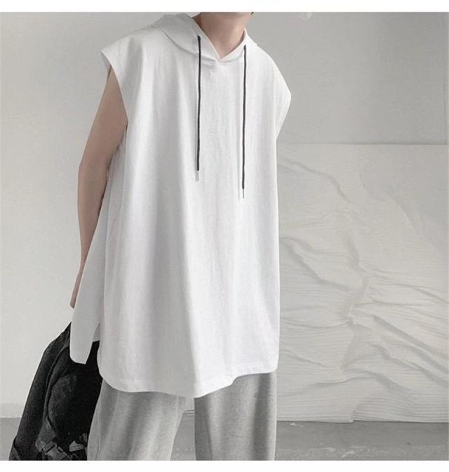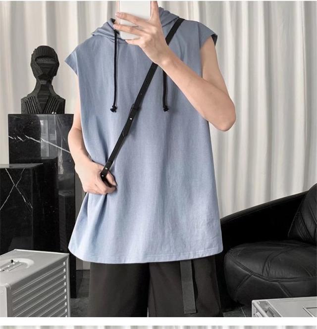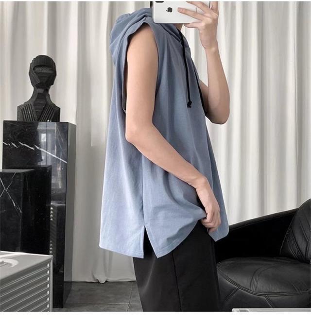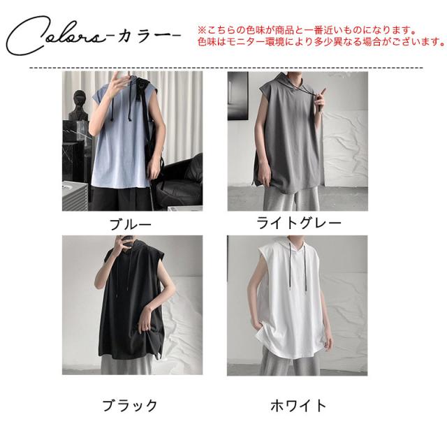 セール タンクトップ メンズ フード付き ノースリーブ パーカー tシャツ 無地 トップス 重ね着 スウェット パーカーベスト 夏