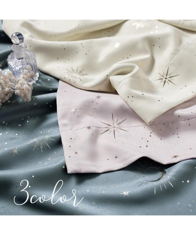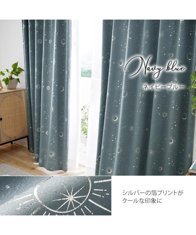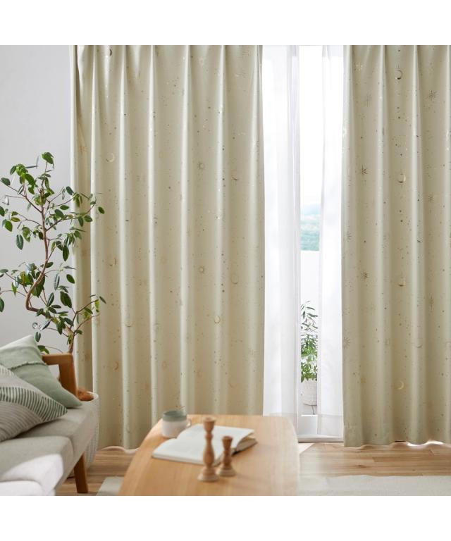 光沢のあるやわらかな生地に太陽や月、星などの天体を箔で表現したカーテンです。カーテンが揺れるたび箔プリントがキラキラ輝くので、お部屋にいながらプラネタリウムを眺めているような印象のお部屋を作ることができます。厚地カーテンの色によって箔の色も違うので、様々なテイストのお部屋にご使用いただけます。■機能 遮光・形態安定■おすすめポイント・特徴 洗濯機OK(ネット使用)■こんなお部屋におすすめ 朝日や西日がよくあたるお部屋、寝室■こんな方におすすめ 光をほどよく遮りたい方 美しいヒダを保ち、上質な空間を演出したい方