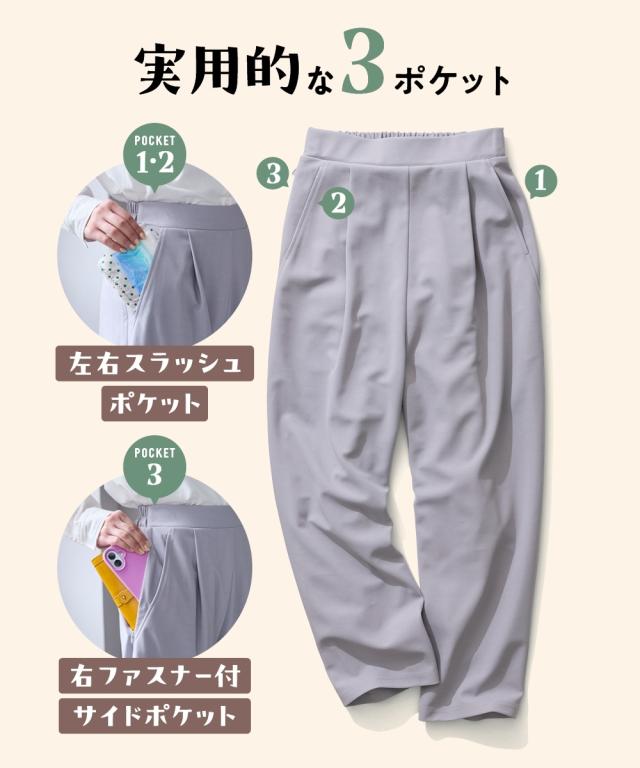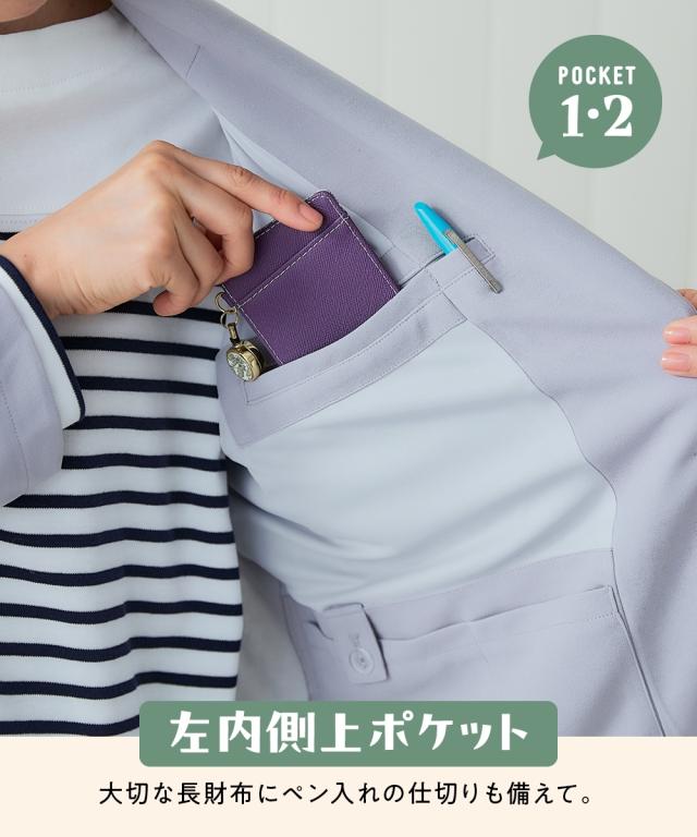 品質=ジャケット:[表地]ポリエステル97%・ポリウレタン3%(カットソージョーゼット) [裏地](前見頃ポケット部)ポリエステル100% パンツ:ポリエステル97%・ポリウレタン3%(カットソージョーゼット) 透け感:なし伸縮性:あり生地の厚み:普通光沢感:なし裏地:あり(ジャケット前身頃ポケット部)ポケット:ジャケット前2(フラップポケット)・脇2(右ファスナー付)・内5 パンツ脇4(ファスナー付2)ウエスト:後ろゴム(フロント部分は素材特性上の伸縮有) 原産国:中国製 備考:ジャケット:手洗い パンツ:洗濯機OK ネット使用