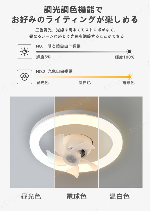 【色温度・明るさ調節可能なファンシーリングライト】シーリングライトは3000K(暖色光)から4500K(中性光)、6000K(白色光)まで3段階の色温度調節が可能で、明るさは10%から100%まで調節可能です。ファンライトはリモコンとモバイルアプリで制御され、自由に調整できます。平均寿命は 50,000 時間です
