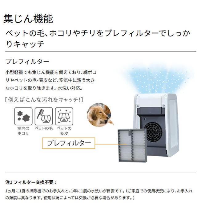 小型軽量でも集じん機能を備えており、綿ボコリやペットの毛・表皮など、空気中に漂う大きなホコリを取り除きます。水洗い対応。