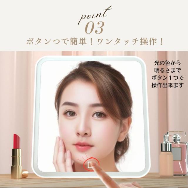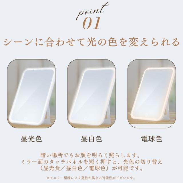 軽量・コンパクトで場所を取らずご利用頂けます。「充電式」・「明るさ無段階調光」・「360°回転」・「3光色切り替え」(昼光食/昼白色/電球色)・「Type-C充電」など、機能満載の多機能ミラー。