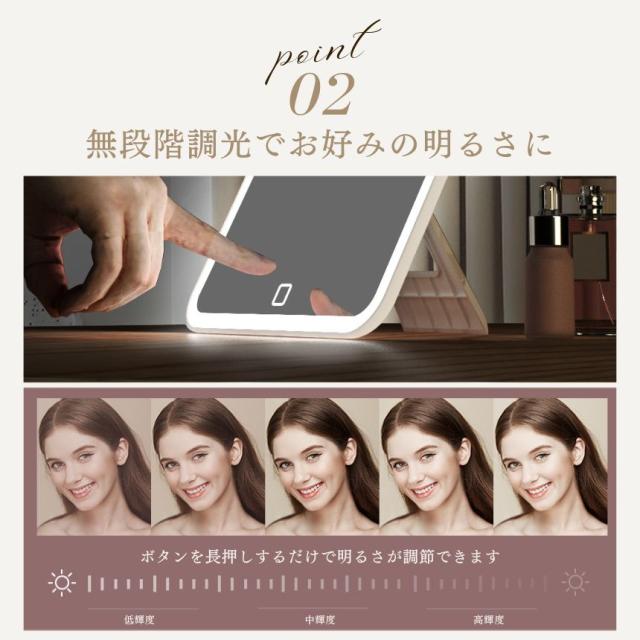 明るさ無段階調整&3光色で無段階調整のLEDライトにより、暗い場所でもお顔を明るく照らします。