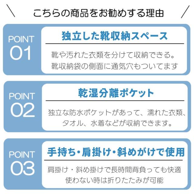 ボストンバッグにはシューズ収納ポケットと乾湿分離ポケットが付属しており、
