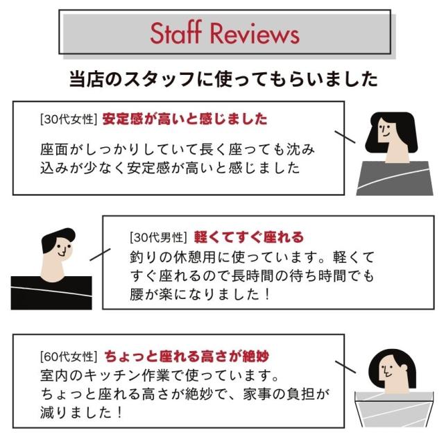キャンプや焚き火、釣り、バーベキュー、登山、花見などアウトドアだけでなく、また、長時間の調理や立ち仕事など、室内での活動にもお勧めです。