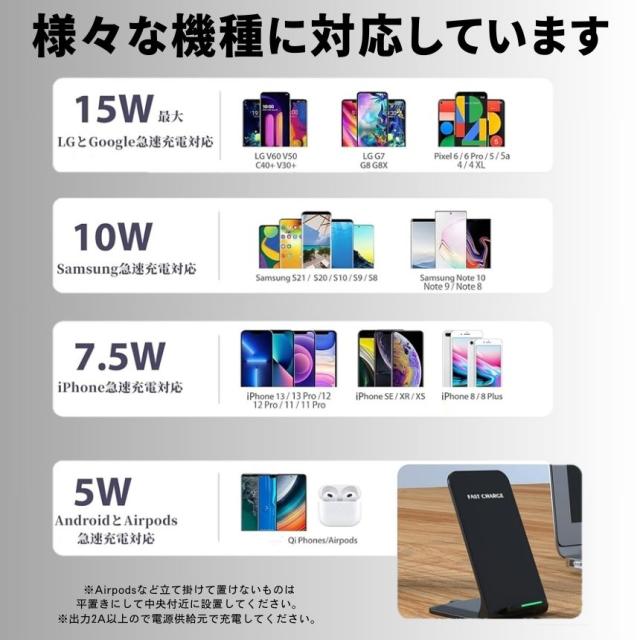 LG の場合は15Wで急速充電、Samsung Galaxy は10Wで急速充電、iPhone は7.5Wで急速充電、またすべてのワイヤレス充電対応デバイスは5Wで充電できます。