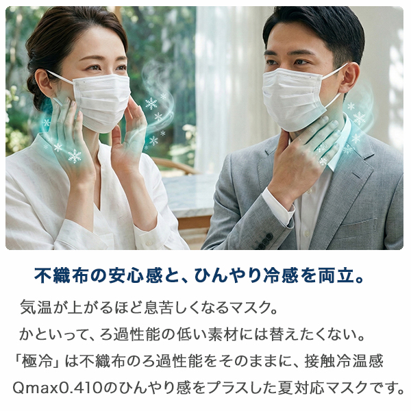 「極冷」は不織布のろ過性能をそのままに、接触冷温感Qmax0.410のひんやり感をプラスした夏対応マスクです。