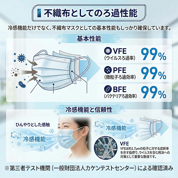冷感機能だけでなく、不織布マスクとしての基本性能もしっかり確保しています。