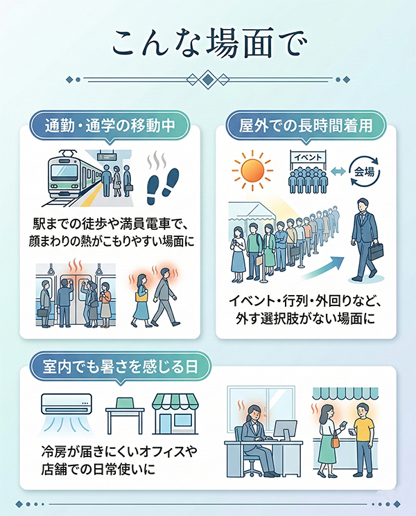 ・通勤・通学の移動中:駅までの徒歩や満員電車で、顔まわりの熱がこもりやすい場面に