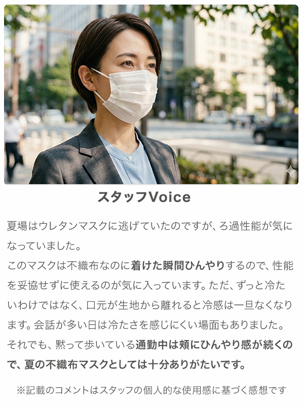 夏場はウレタンマスクに逃げていたのですが、ろ過性能が気になっていました。 このマスクは不織布なのに着けた瞬間ひんやりするので、性能を妥協せずに使えるのが気に入っています。 ただ、ずっと冷たいわけではなく、口元が生地から離れると冷感は一旦なくなります。 会話が多い日は冷たさを感じにくい場面もありました。それでも、黙って歩いている通勤中は 頬にひんやり感が続くので、夏の不織布マスクとしては十分ありがたいです。