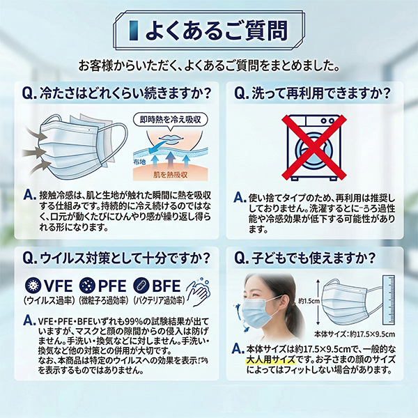 A. 接触冷感は、肌と生地が触れた瞬間に熱を吸収する仕組みです。持続的に冷え続けるのではなく、口元が動くたびにひんやり感が繰り返し得られる形になります。