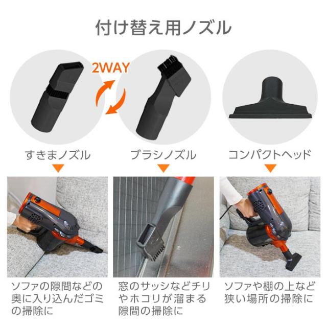 すきまノズル&ブラシノズル(2Way仕様)、コンパクトヘッドが付属しているので、1台で隅々までお掃除できます。