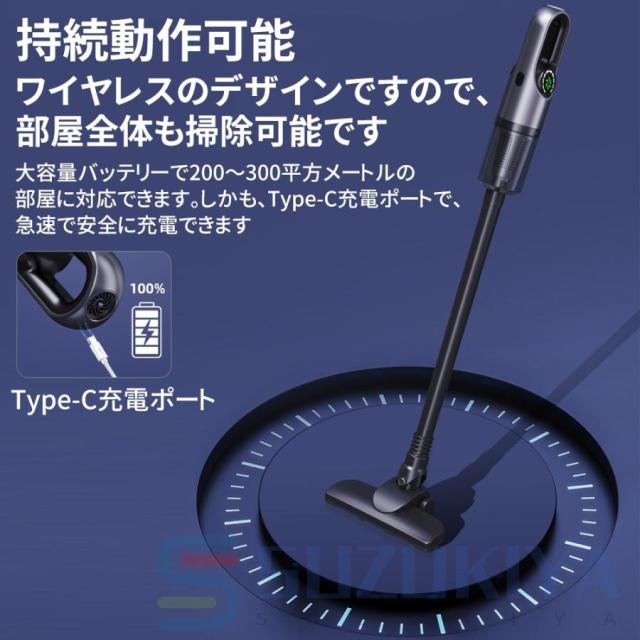・周波数変換ブラシレスモーター、タービンダクトも搭載されています、吸引力が45000Pa以上に達します。床面の微細なホコリからペットの毛、隙間に潜むホコリも、この掃除機で逃しません、一往復で残りなし!超強力な吸引力と低騒音を両立させており、掃除機動作中の音が大幅軽減。ワイヤレスのデザインですので、部屋全体も掃除可能です。過熱保護機能で高温になると、自動的に動作停止します。夏も安心して利用しましょう