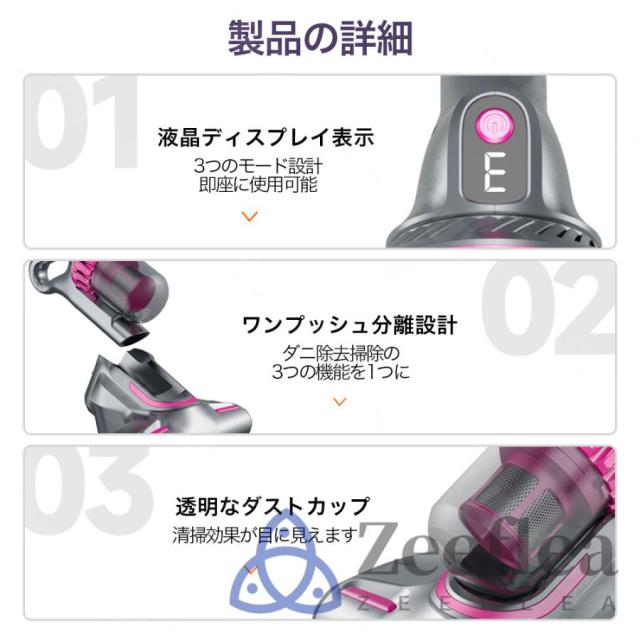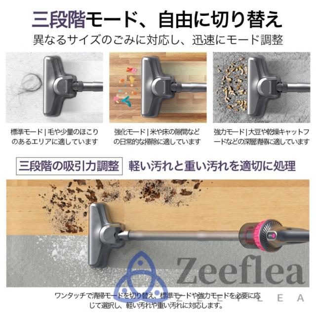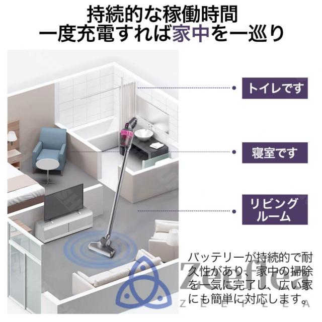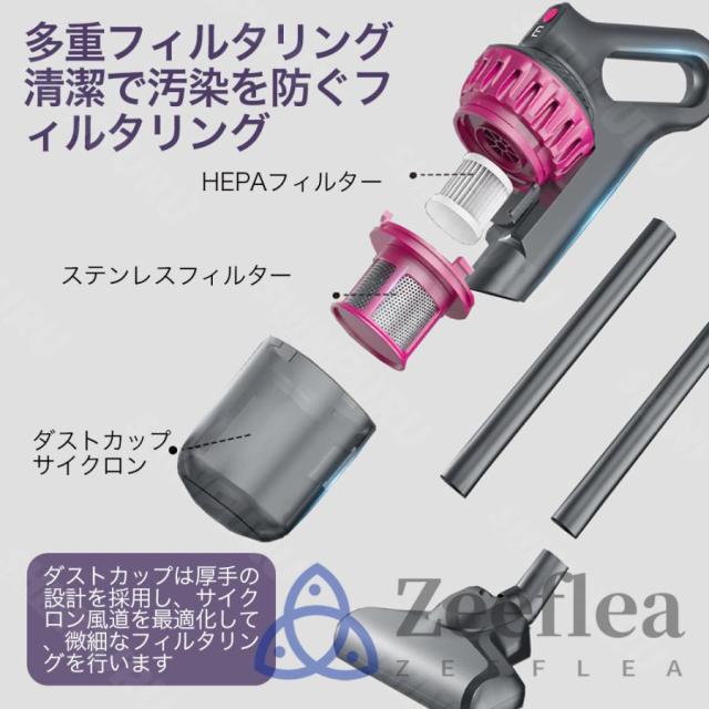 この掃除機は、2000mAh*3の大容量バッテリーを搭載しており、最大で30分の連続使用が可能です。一度の充電で家全体の掃除が完了するため、充電時間を気にせず使用できます。さらに、低騒音設計により、早朝や深夜でも周囲に迷惑をかけることなく、静かに掃除が行えます。パワフルながら静かな運転音は、日常の騒音ストレスを軽減し、家族や隣人を気にせず快適に使用できるのが魅力です。多重フィルターシステムが微細なホコリやアレルゲンを確実に捉え、清潔な空気を排出します。