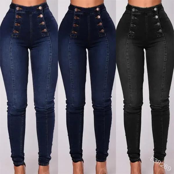 女性のストレッチパンツ,タイト,カジュアル,ダブルブレスト,ストレッチ,ハイウエスト,デニム